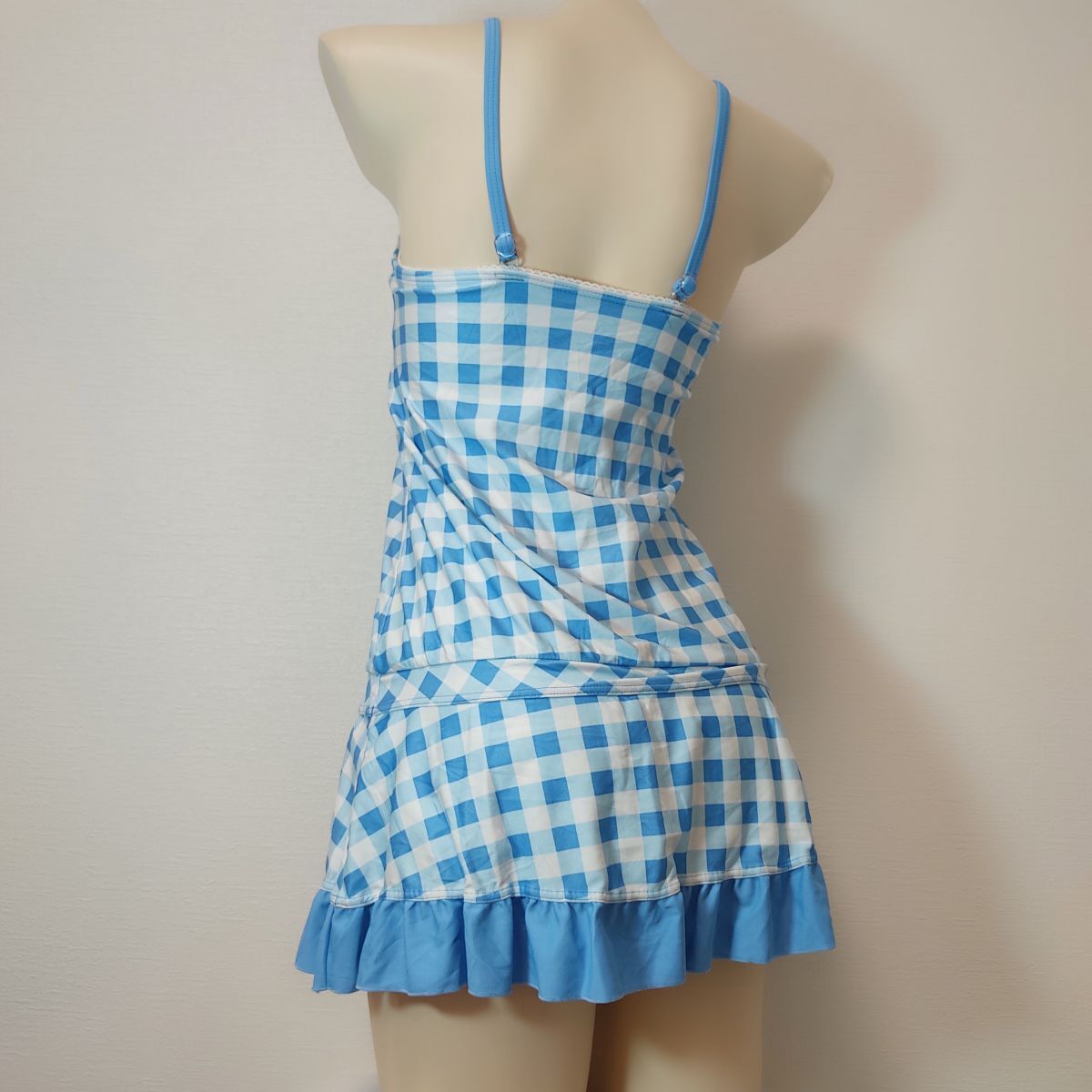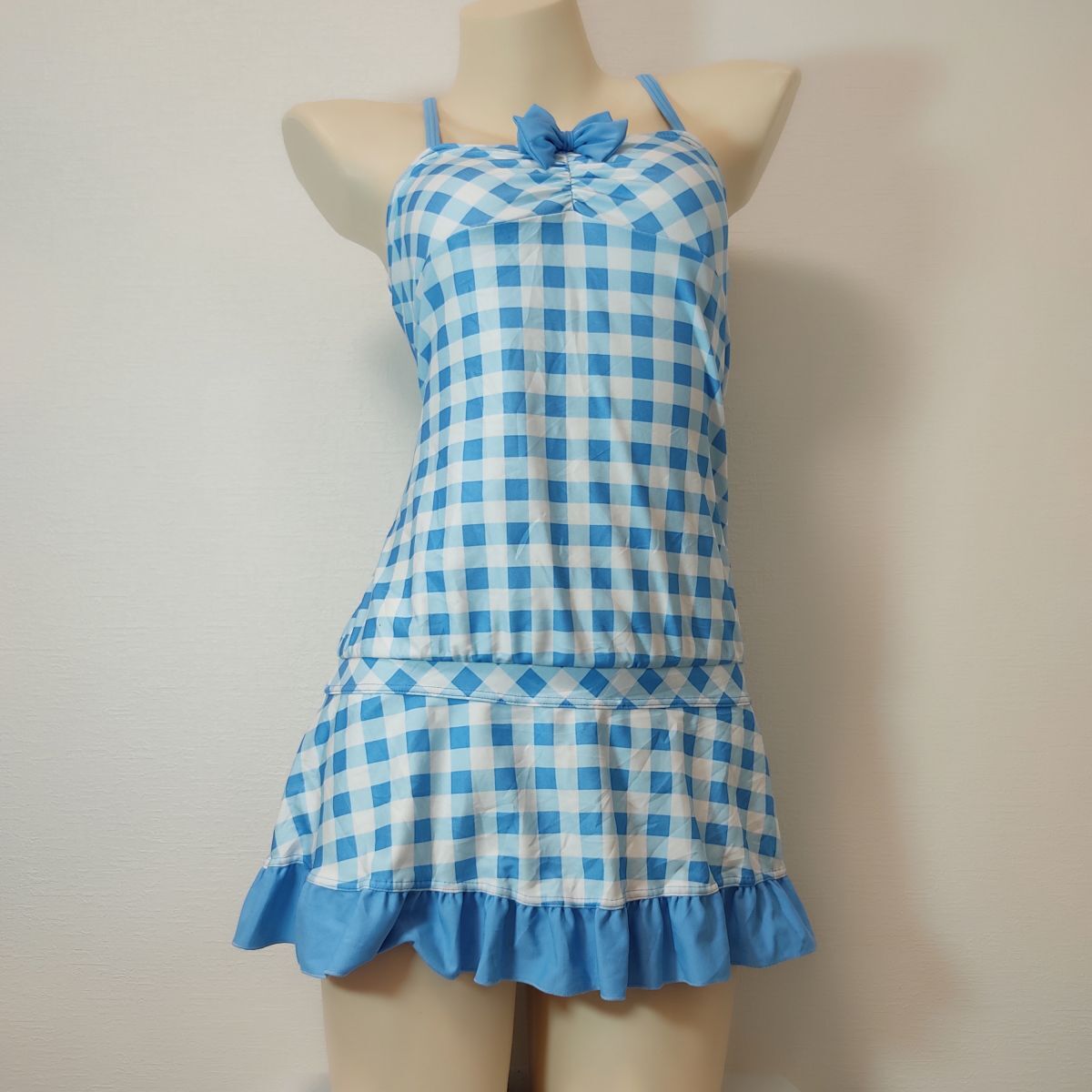 19*グレイス女子水着(170XL程度)★フリルスカート股上ハイレグ光沢ブルー水色ホワイト白チェック リボン★伸縮性あり大きいサイズ男性も