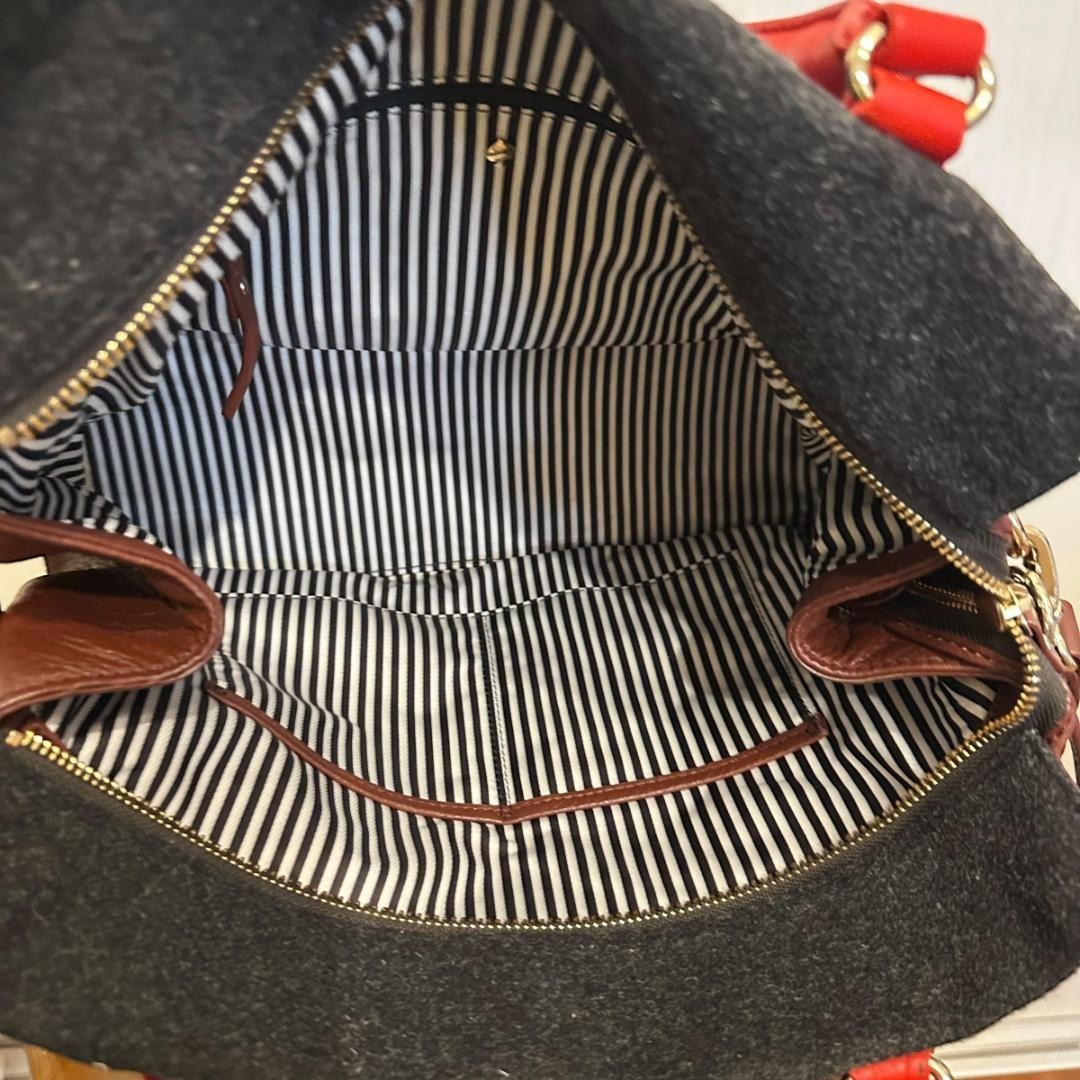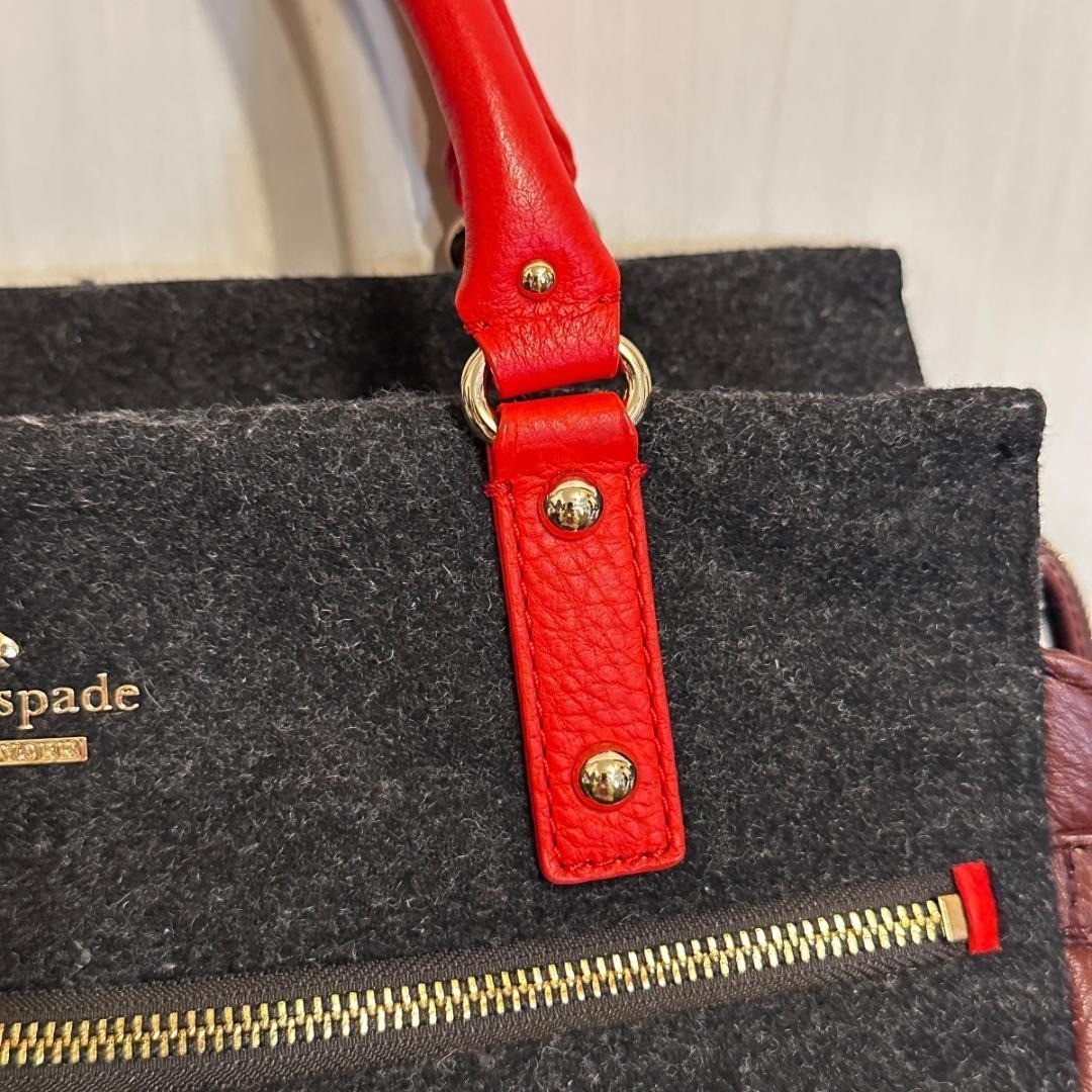 #katespade のウール×レザーショルダーバッグです。素材の組み合わせが美しく、秋冬らしいぬくもりと高級感を兼ね備えたデザイン。落ち着いた色合いにゴールドの金具が映え、エレガントで洗練された印象を与えます。トートとしてもショルダーとしても使える2WAY仕様で、オンオフ問わず活躍。マチが広く収納力も抜群で、デイリー使いからお出かけまで幅広いシーンに対応します。