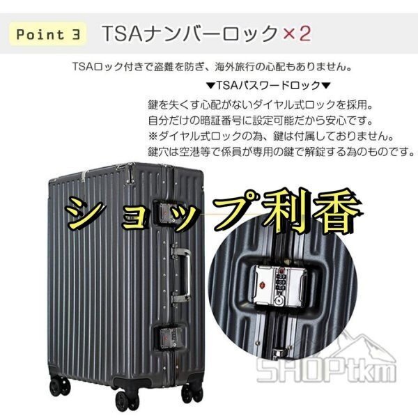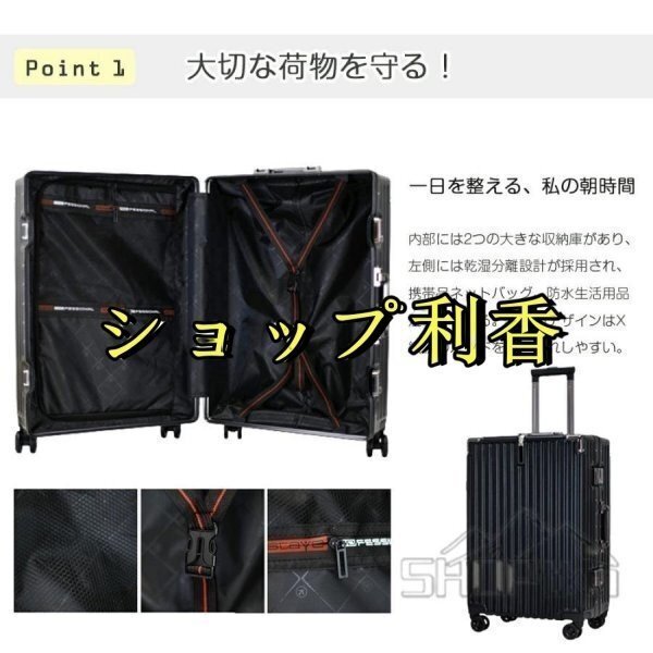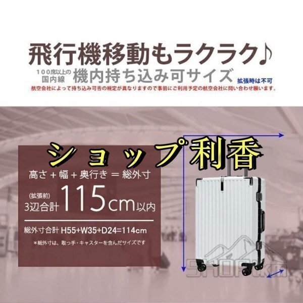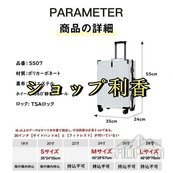 商品説明 商品説明 商品説明 素材:ポリカーボネート ABS樹脂+PC サイズ(キャスター含む外寸):約55×35×24cm 重量:約3.8kg 容量:約39L TSAロック:ダイヤル式 開閉タイプ:アルミフレーム カラー:8色 ※商品のタグに誤りがある場合がございます。 ページに記載の通りですが、