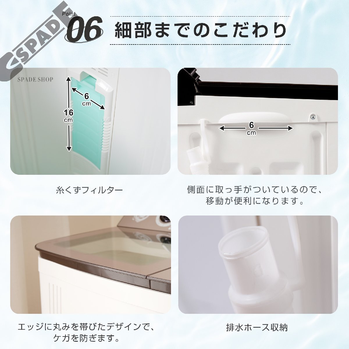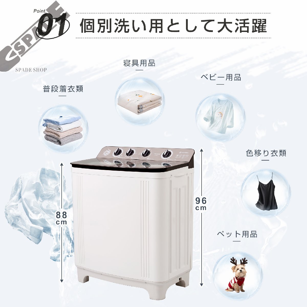 • 【同時に洗濯と脱水が可能で、時間を短縮!】洗濯と脱水が同時に運行できる2槽式の洗濯機では、色落ち衣類、下着、ベビー服、介護用品、ペット用品など、いろいろな分け洗いのニーズがある衣類の洗濯時間を大幅に節約することができます。