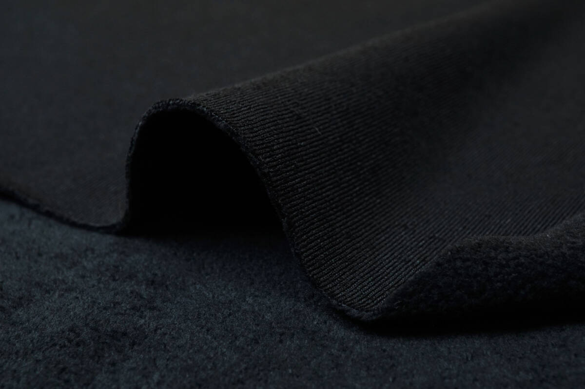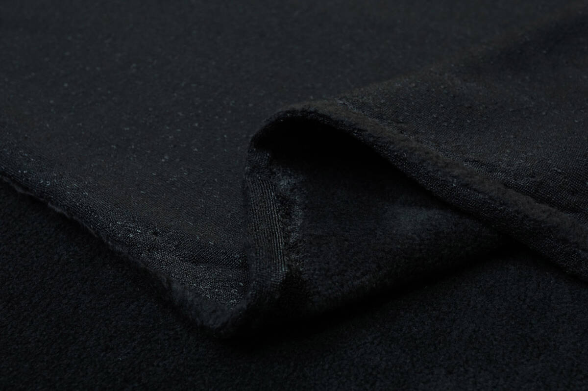 ポリエステル100%、微薄~中厚、片面がふんわりソフト起毛(方向性あり)でタンブラー加工、1WAY伸縮、色調:ブラックでございます。
