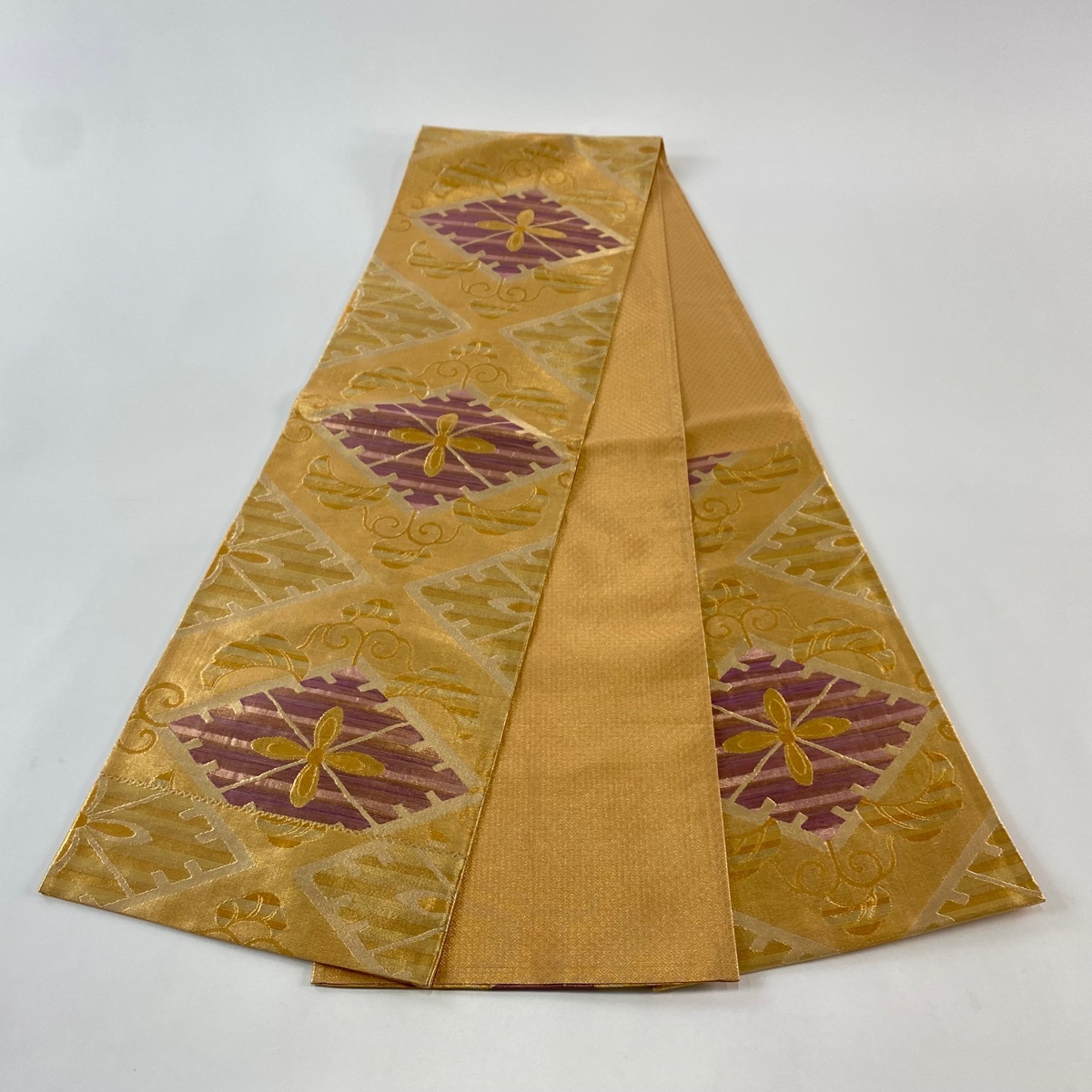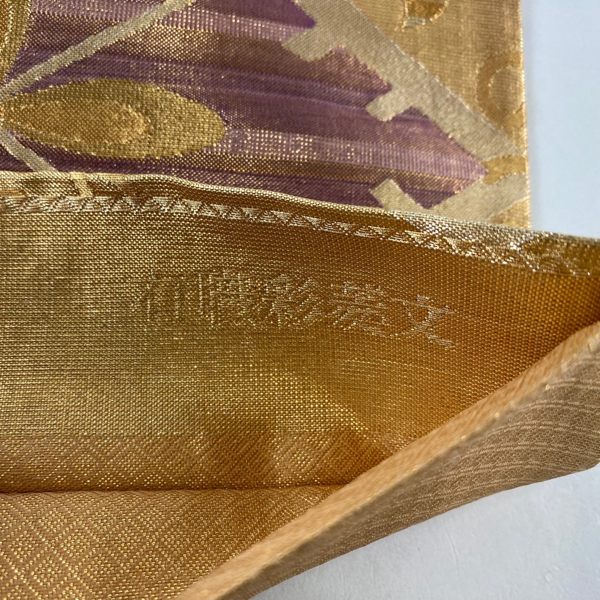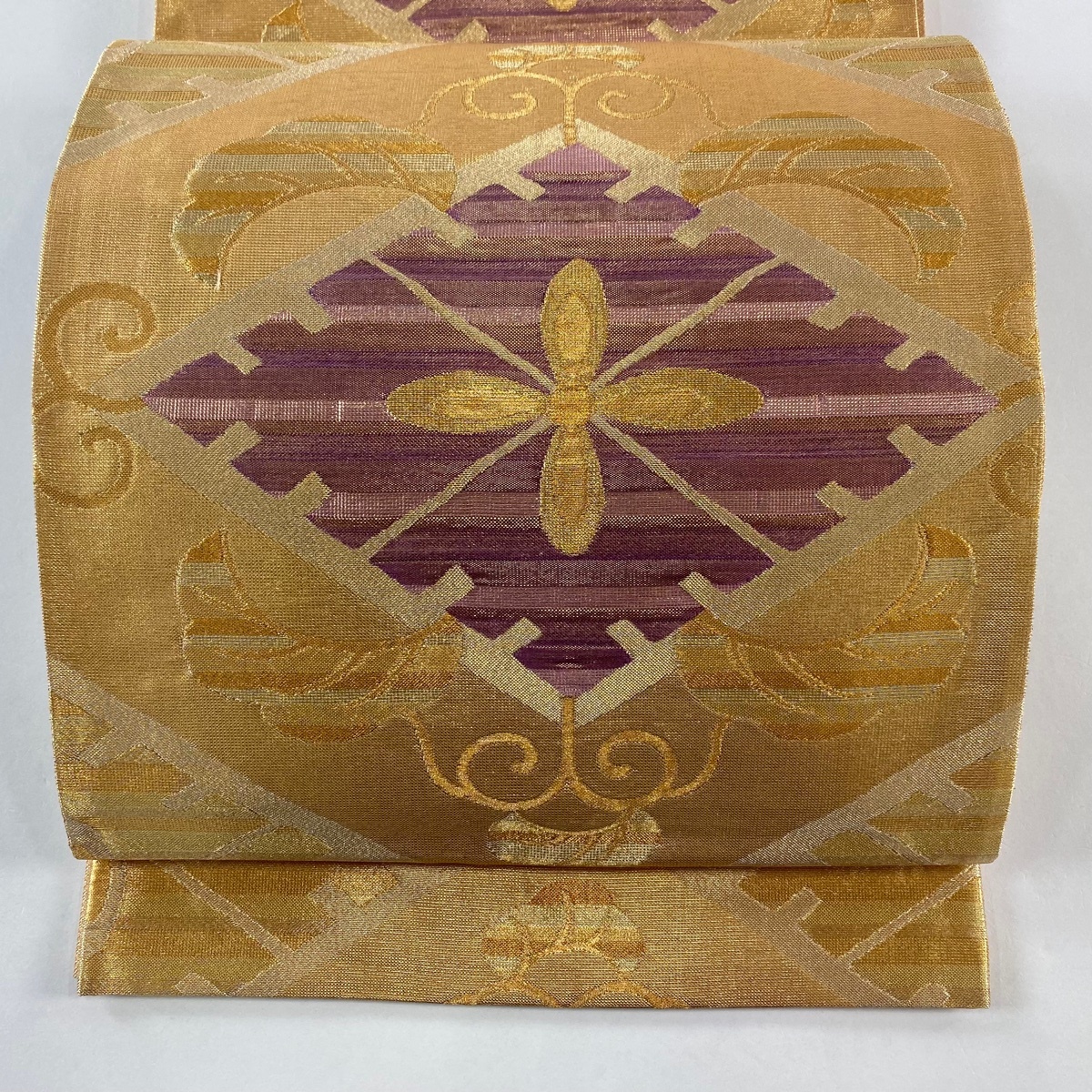 | 袋帯 名品 帝王紫 落款 有職彩菱文 縞 金糸 箔 金色 六通 正絹 【中古】 |
