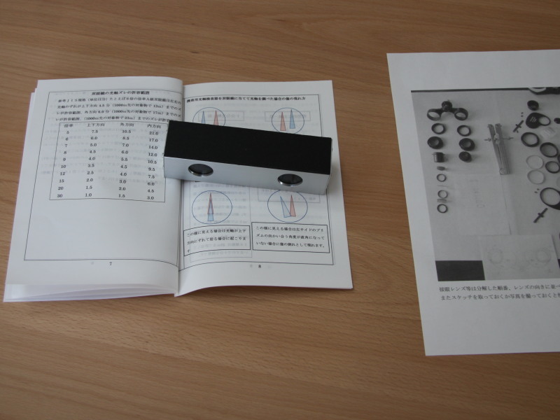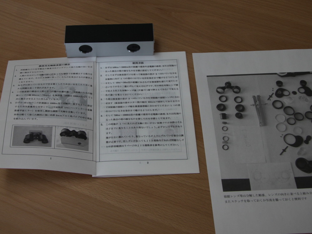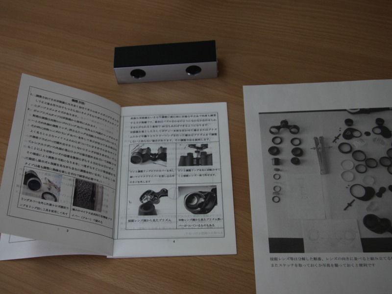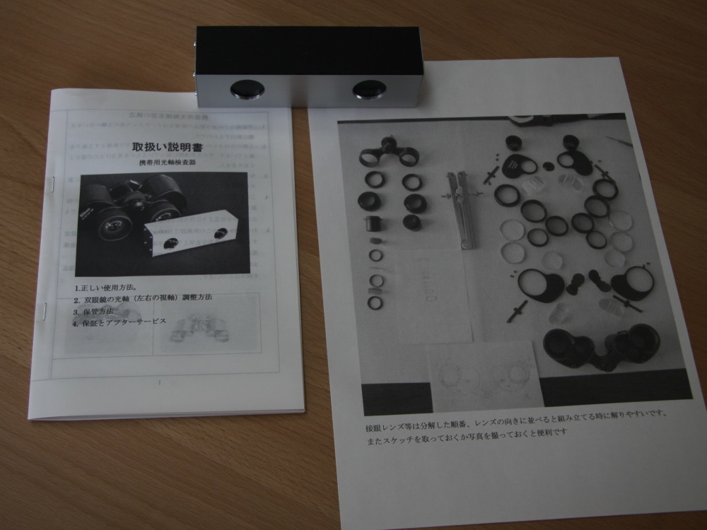光軸調整の説明書のみの出品です。まずは光軸調整とはどの様な事なのか興味のある方検査器を購入する前に知っておきたい方の為に、入門編として解説しました。双眼鏡の修理に興味のある方、または今保有している双眼鏡を最高レベルに調整したい方に基礎知識としての解説です。 双眼鏡はカメラ同様かそれ以上に大変デリケートな物です。また少しのショックでも微妙に左右の光軸がずれてしまいます。またレンズやプリズムにカビやボデー内部の塗装の剥がれなどが原因でゴミの付着が気になり自分でクリーニングしたまでは良いが組み立てて覗いてみると左右の光軸がズレてしまい覗くとめまいがすることがあります。 これは目から入った画像情報の左右のずれを脳内の自動調整機能で無理やり調整しているからです。 これはとても危険な状態で目と脳を著しく損傷させます。 中古で販売されている双眼鏡は検査器で調べてみますとほとんど光軸がずれています(軽微なものは人間の目の自動補正で処理してしまうのでちょっと変な感じ程度で気が付かない場合もあります)しかし検査器を使用して調整してから覗いてみますとこんなにも快適に使用できるのかと驚かされます。 双眼鏡を何台もお持ちの方は平行器は必需品と思いますがその前にまずはどんなものか知っておきたい方におすすめ。