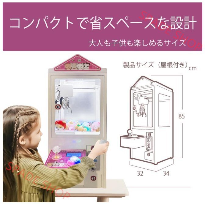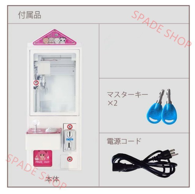 品名:コンパクトクレーンゲームマシン 材質:金属製 サイズ:74L x 32W x 34H cm 重量:25kg 景品サイズ:10-14cm 硬貨のサイズ:直径は22~28mm、厚さは1.7~2.2mm 定格電圧:AC100V-110V 周波数:50/60Hz(日本国内仕様) 特徴:コンパクト 子供向け プレゼント カラーディスプレイ 操作簡単 LEDライト 硬貨または日本円でも対応可能 1.硬貨または日本円でも対応可能です。使用される硬貨は、硬貨の直径に基づいて設定されます。対応可能な硬貨の直径は22-28mm、厚さは1.7-2.2mmです。 2.LEDライトの効果に加えて、屋根とコントロールパネルも美しくデザインされています。色を効果的に使い分け、製品のデザイン性にもこだわっています。 3.子供たちでも手軽に遊ぶことができる設計となっています。子供向けに易操作なコントロールパネルが設けられており、四方向のジョイスティックで前後左右に自由に動かすことが可能です。 4.製品サイズは34*32*85cmで、広々とした内部空間に多数の景品を入れることができます。10cmまでの景品に対応しているため、多彩な景品が楽しめます。簡単な操作感を実現する4方向レバーと、優れた液晶ディスプレイを備えています。簡単な操作感が利用者に親しまれ、さまざまな年代の方にお楽しみいただけます。 5.コンパクトクレーンゲームマシン:業務用、家庭用、イベントに対応可能な、コンパクトで省スペースな設計です。 ★★★商品は輸送過程で損傷する可能性があるため、外装箱に木製フレームを取り付けて補強いたします。これにより、輸送中の安全性を確保いたします。 ★★★また、商品は生産ロットの違いにより微細な差異が生じる場合があります。あらかじめご通知することはできませんので、ご了承ください。