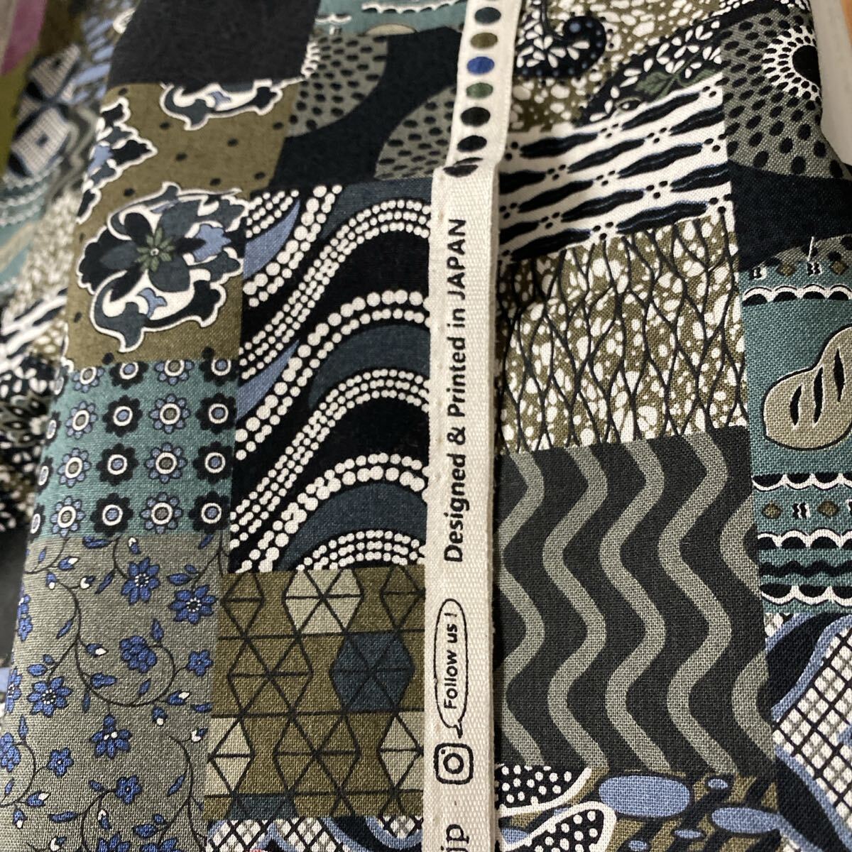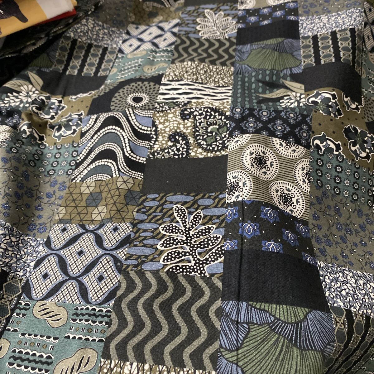 日本製のパッチワークデザインの綿生地、青と緑の色合いが特徴。