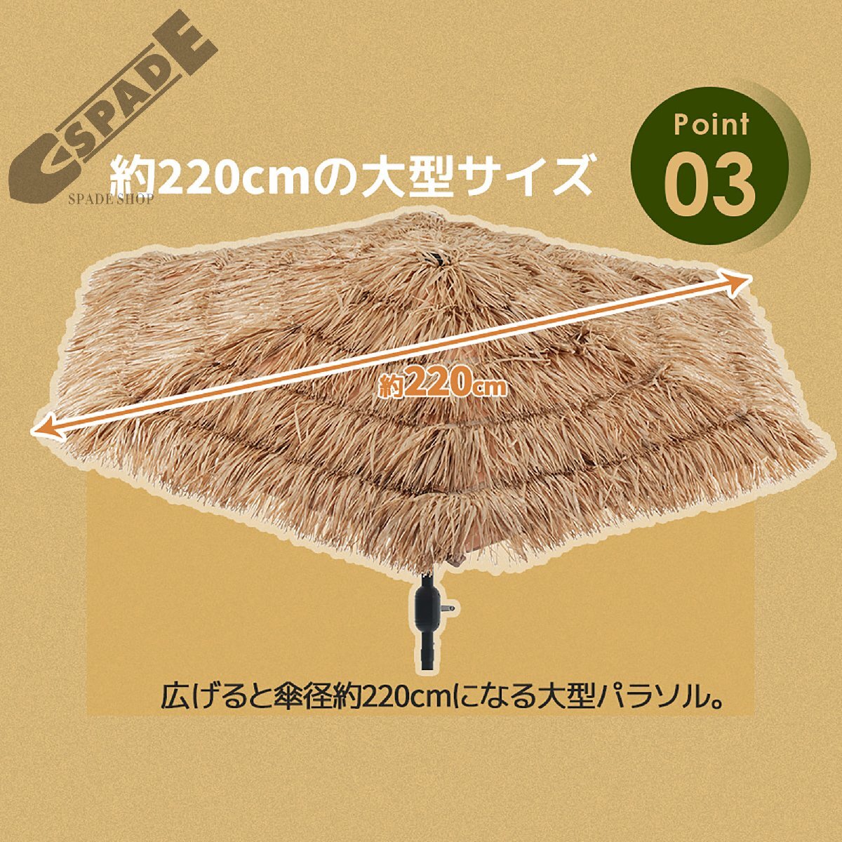 • 【紫外線をしっかりカット 】傘生地にはUVカット加工を施してあるので紫外線をしっかりと防ぎます。 30+UPF わら調 PE 素材を採用 自然の風合いを持ちながら耐久性に優れ、手入れも簡単です。 急な雨でもしっかりと水を弾く安心の撥水加工 お庭やバルコニーでのひとときを、どんな天候でも楽しむことができます。※完全防水ではありません。