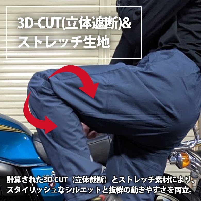 計算された3D-CUT(立体裁断)とストレッチ素材により、スタイリッシュなシルエットと抜群の動きやすさを両立。