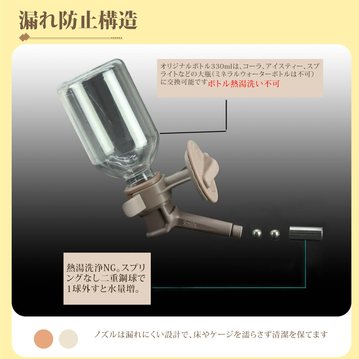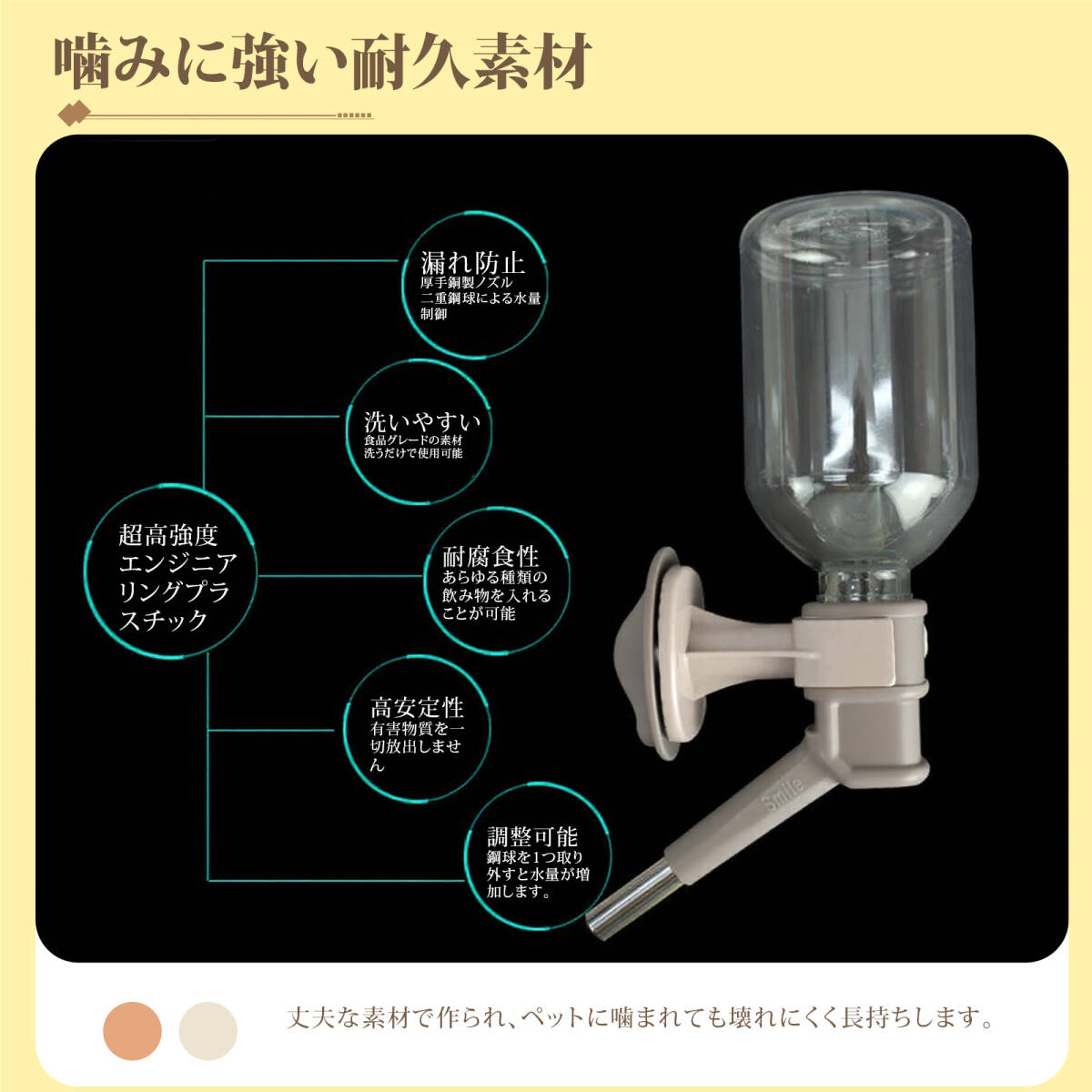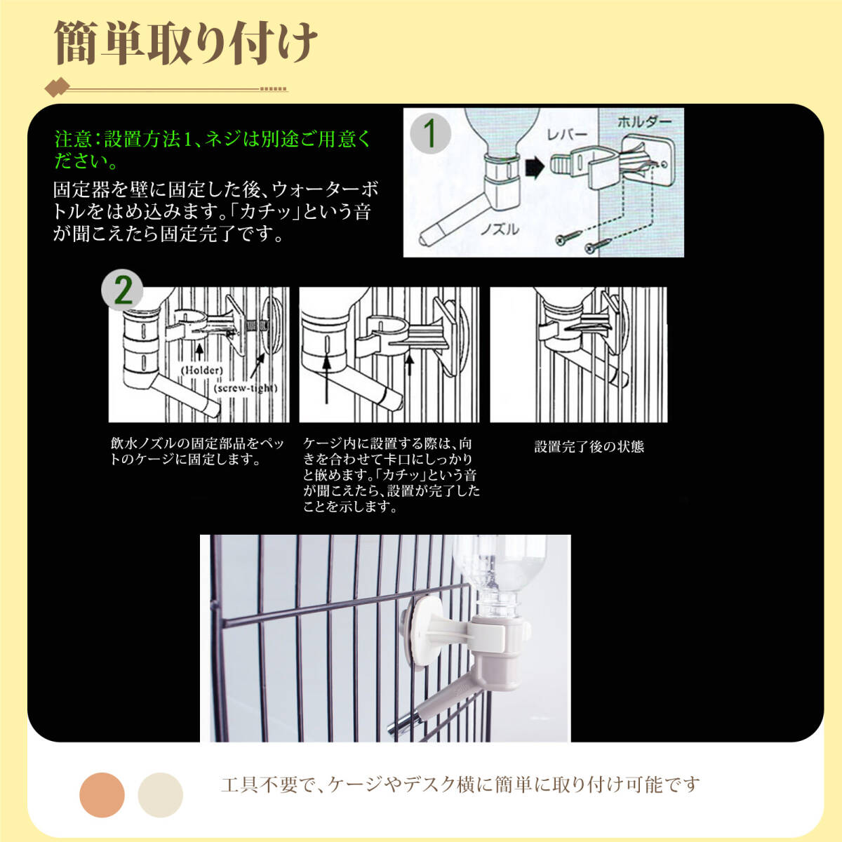 | この商品について | 【 ノードリップ&二重ボール設計】:ステンレス製の二重ボール構造で、水漏れを防止し、ペットのお口周りが濡れにくい設計。1つのボールを外すと水量が増え、子犬や成長期の猫にも対応可能。 【安定感のある取付&防滑仕様】:ケージにしっかり固定できる防滑デザイン。市販の多くのケージに対応(適用杆間隔:2〜5.5cm、杆厚さ:2cm以内)。元気に動き回るペットでも安心。 【お手入れ簡単&使いやすい】:水の補充はキャップを回すだけ。部品は取り外して洗浄でき、清潔に保てます。(※熱湯消毒は不可)毎日の使用にも負担にならない設計。 【簡単ステップで装着】:ノブを緩めてケージの両側にセット しっかり固定 カチッと装着&取り外し可能 ボトルを締めて準備完了! 【小型ペットに最適】:体重約10kg以下の小型犬・子犬・猫におすすめ。お留守番や旅行時の水分補給にも便利。 |