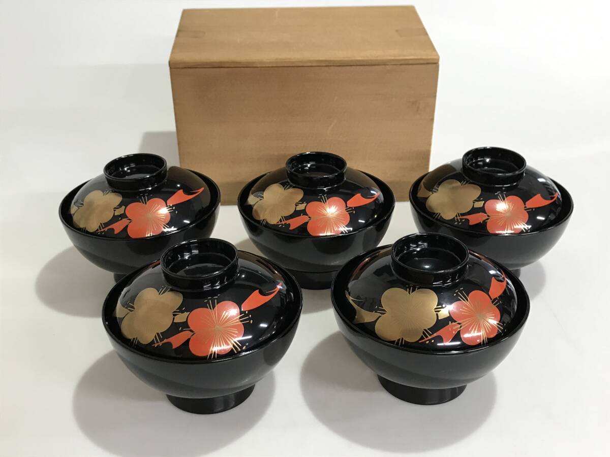 | 商品名 | 吸物椀 5客揃 汁椀 漆芸 漆器 和食器 木製漆器 伝統工芸品 黒地 金 銀 朱 共箱付き |