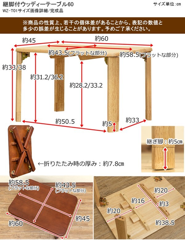 | サイズ | (W)幅60cm×(D)奥行き45cm×(H)高さ33/38cm 天板の厚み:約1.8cm 折りたたみ時の厚み:約7.8cm |