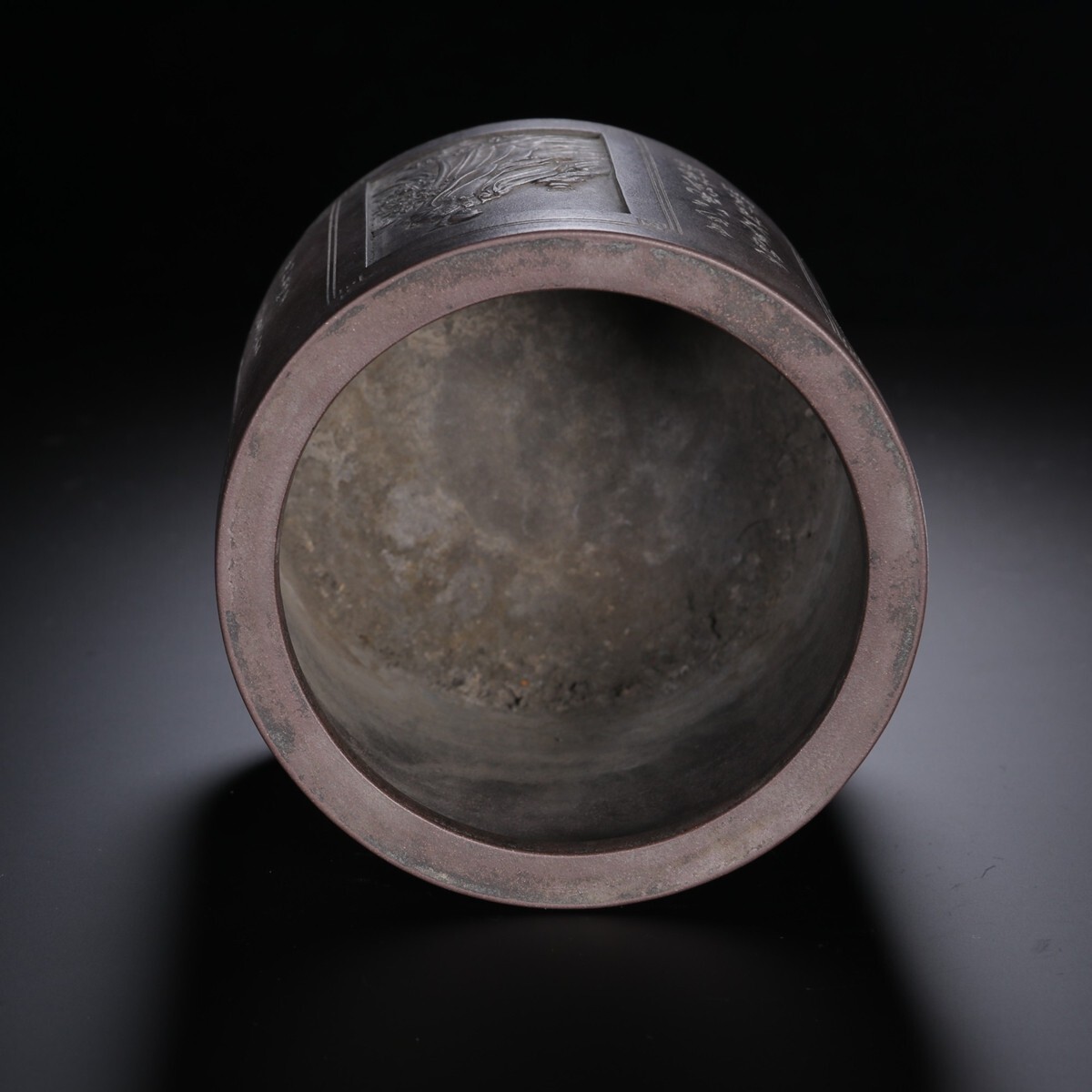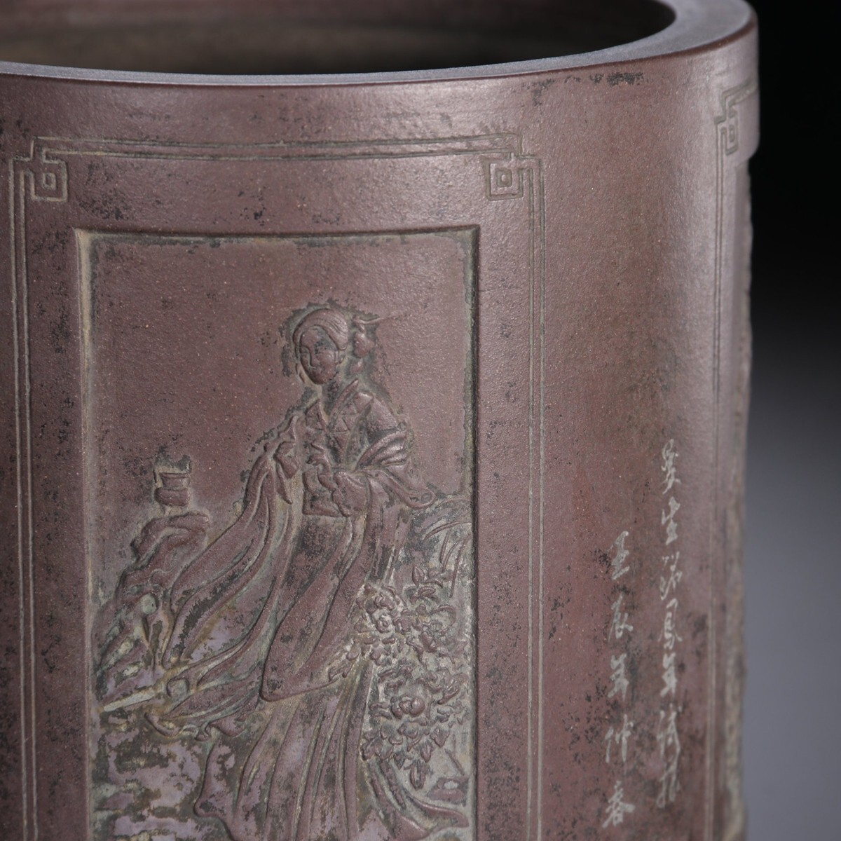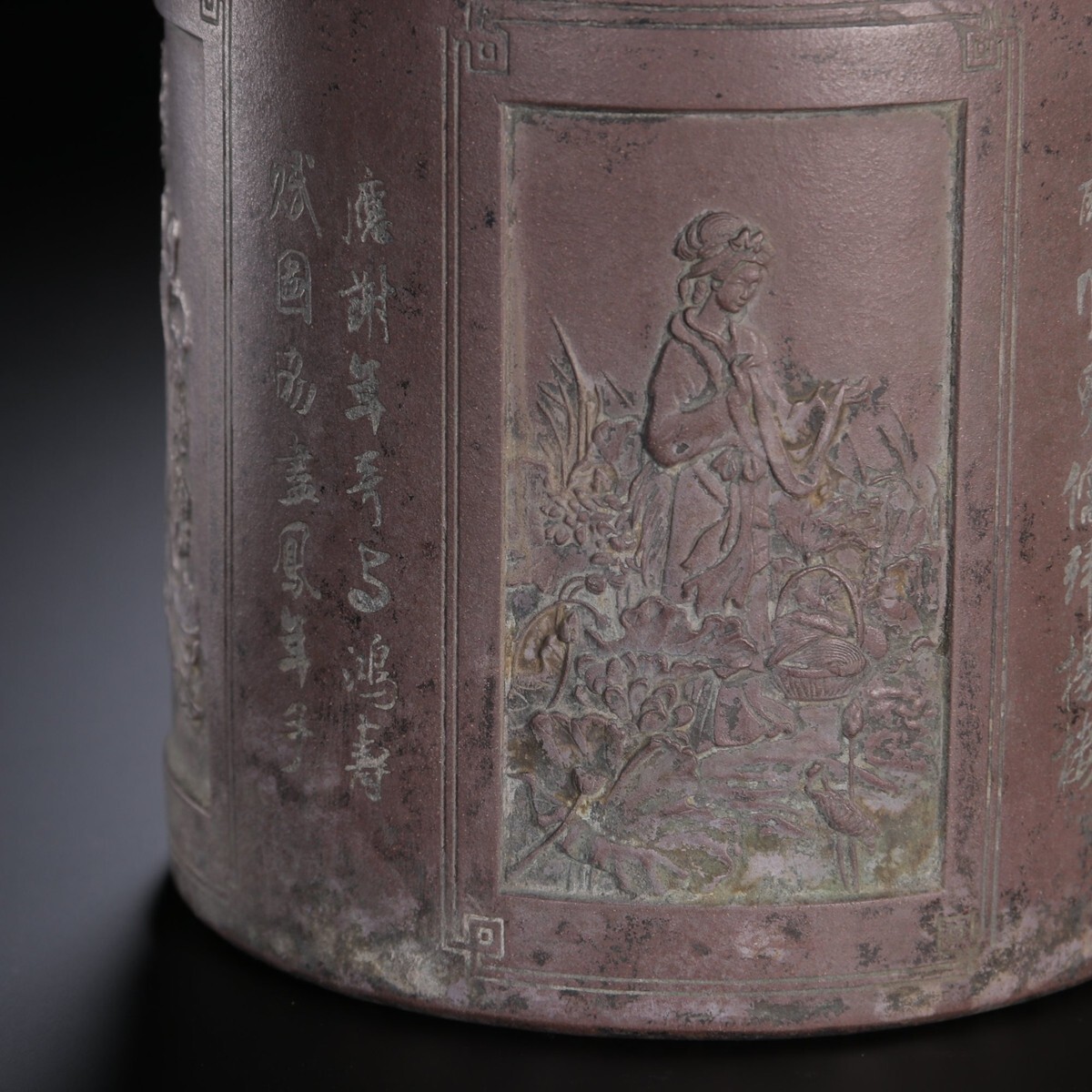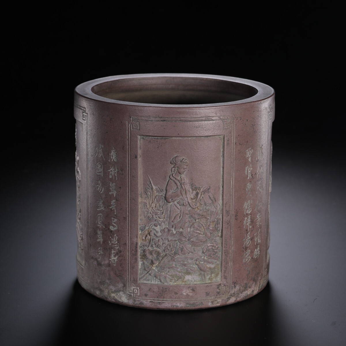 「紫砂彫 四大美女 詩文筆筒 楊彭年銘 清時代」陶磁器 置物 擺件 古賞物 中国古美術 蔵出