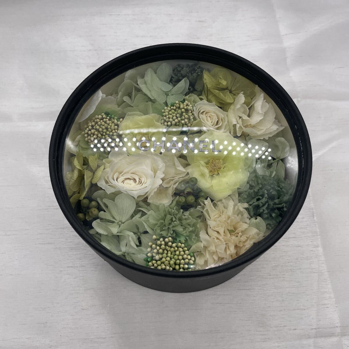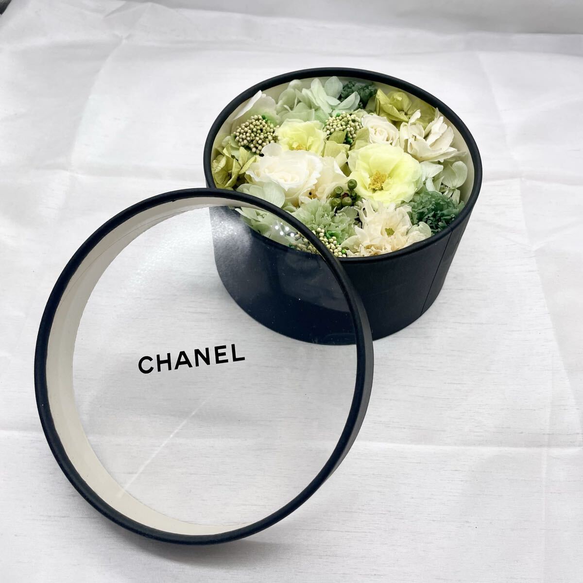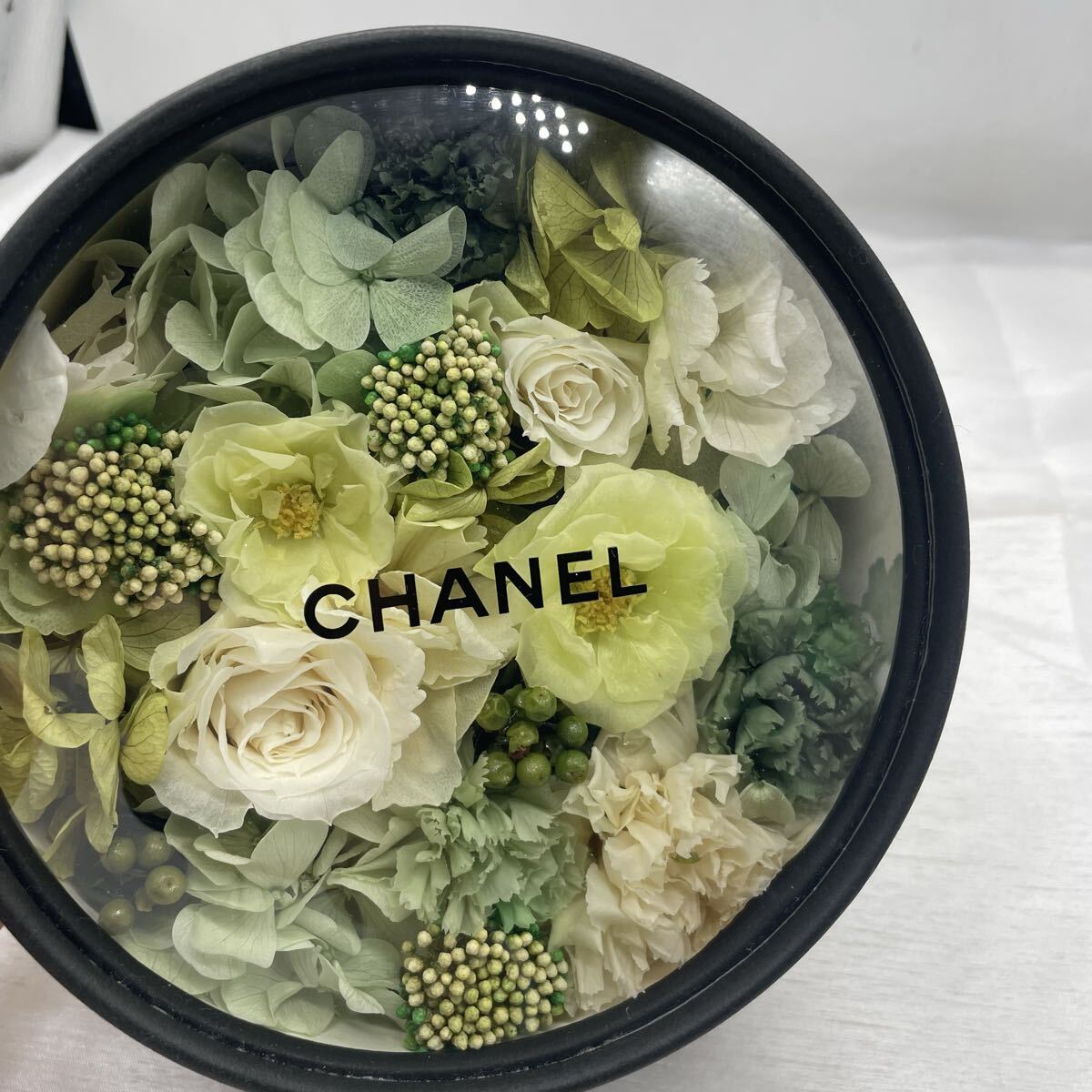 透明フタに「CHANEL」ロゴが入った上品なデザインで、内部には淡いグリーン×ホワイト系のプリザーブドフラワーが美しくアレンジされています。