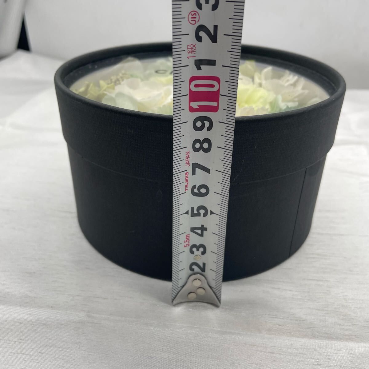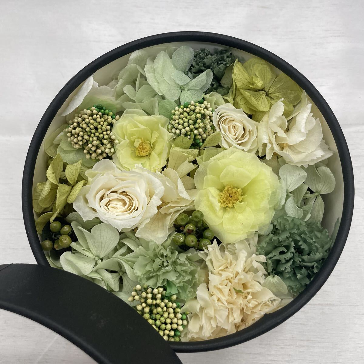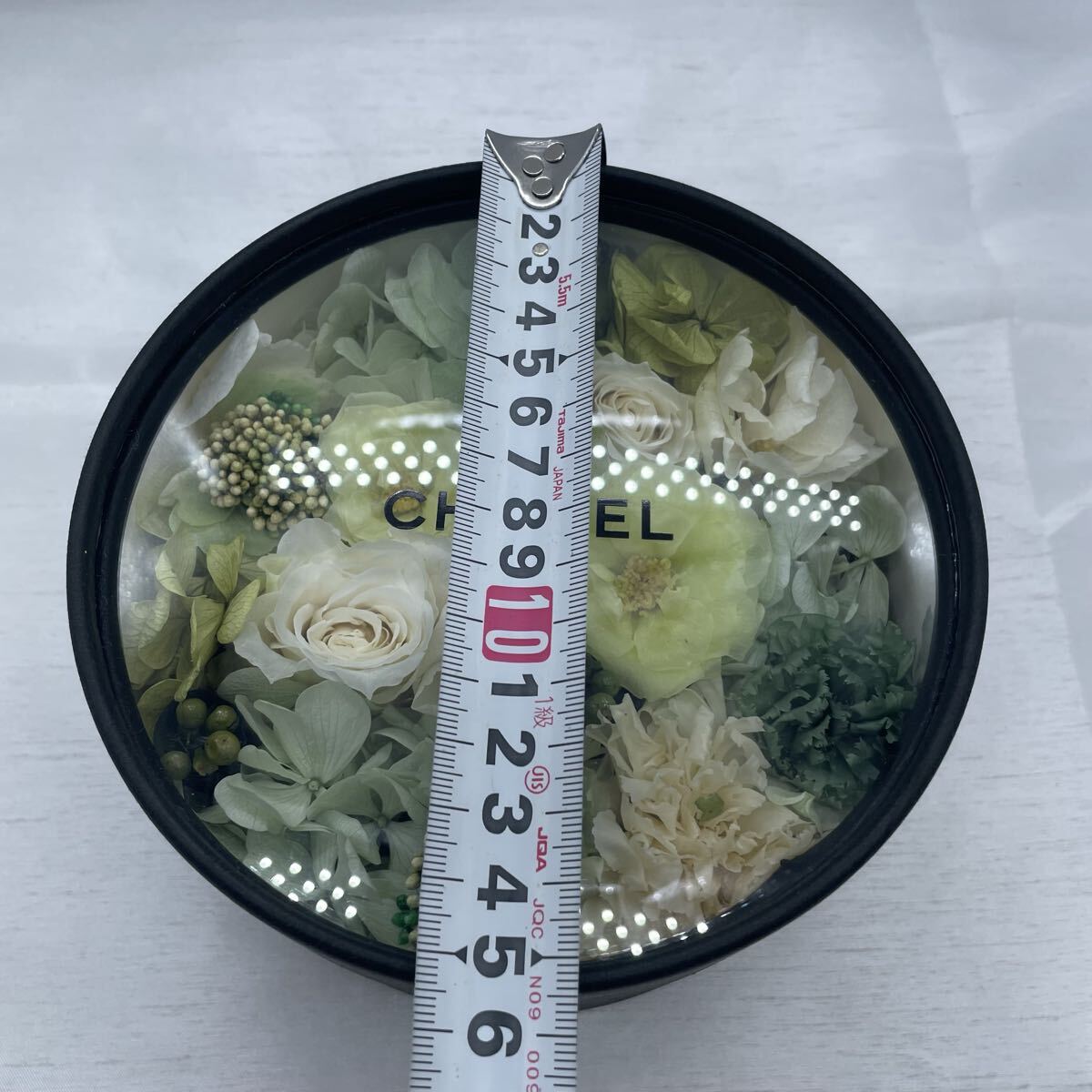 透明フタに「CHANEL」ロゴが入った上品なデザインで、内部には淡いグリーン×ホワイト系のプリザーブドフラワーが美しくアレンジされています。