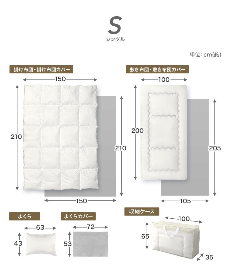 ISO9001認可工場で生産された安心の品質! 届いてすぐ使える寝具セット! 掛け布団は高級布団などにも使われるフェザーを100%使用しているので 冬場は暖かく、夏場は蒸し暑くなりにくく オールシーズン快適に過ごすことができます! 敷き布団はフローリングや畳の上に直接敷いても痛くないよう 芯のある固綿を、ふんわり柔らかな中空ポリエステル綿で サンドイッチした三層式構造を採用! 枕は中空ポリエステル綿を使用! ボリュームがあるので、しっかりと頭部を支えてくれます! \各種カバー付き!/ カバーは洗濯機で丸洗いができるので、とっても衛生的! 万が一、汚れてしまった時や何かこぼしてしまった時も安心です! すぐ使えるから、こんな方におススメ♪ ・一人暮らしや新生活を始める方 ・来客者用の布団一式を考える方 ・布団・寝具の買い替えを考える方 ・社員寮など業務用として考える方 【商品仕様】 カラー:ネイビー サイズ:シングル 掛布団/敷布団/枕/掛布団カバー/敷布団カバー/枕カバー/収納袋 梱包重量(約):11kg ISO9001認可工場で生産/ 抗菌防臭加工/ファスナー仕様 《商品内容》 【掛布団】 サイズ(約):幅147×長さ210cm 生地:フェザー、ポリエステル 充填量:2.2kg 【掛布団カバー】 サイズ(約):幅147×長さ210cm 生地:ポリエステル 止め紐:6箇所 【敷布団】 サイズ(約):幅100×長さ195cm 生地:固綿、中空ポリエステル綿 【敷布団カバー】 サイズ(約):幅104×長さ203cm 生地:ポリエステル 【枕】 サイズ(約):幅60×奥行37cm 生地:中空ポリエステル綿 【枕カバー】 サイズ(約):幅72×奥行53cm 生地:ポリエステル 【収納袋】 サイズ(約):幅100×奥行36×高さ67cm 生地:不織布 【注意事項】 ・羽根は、天然素材のため、特有のにおいがございます。洗浄は十分に行っておりますが 開梱直後や湿度・温度などの環境により臭いを感じる場合がございますので ご使用の前に風通しの良い場所での陰干しをお勧めいたします。 ・洗濯する際は、必ず商品に付いている洗濯表示マークをご確認ください。 ・商品は、モニターによって色合いが異なって見える場合があります。 ・仕様・デザインは改良のため予告なく変更することがあります。 |