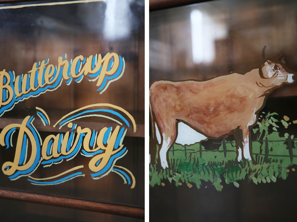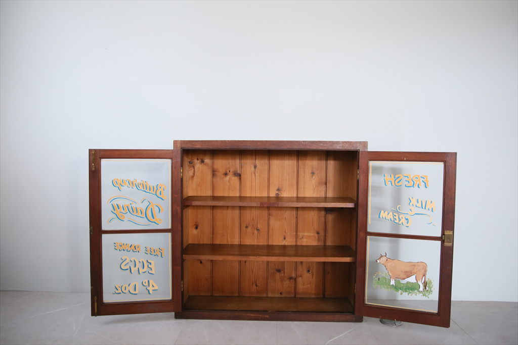 イギリスの田舎で見つけた古木の英字入りディスプレイキャビネットです。