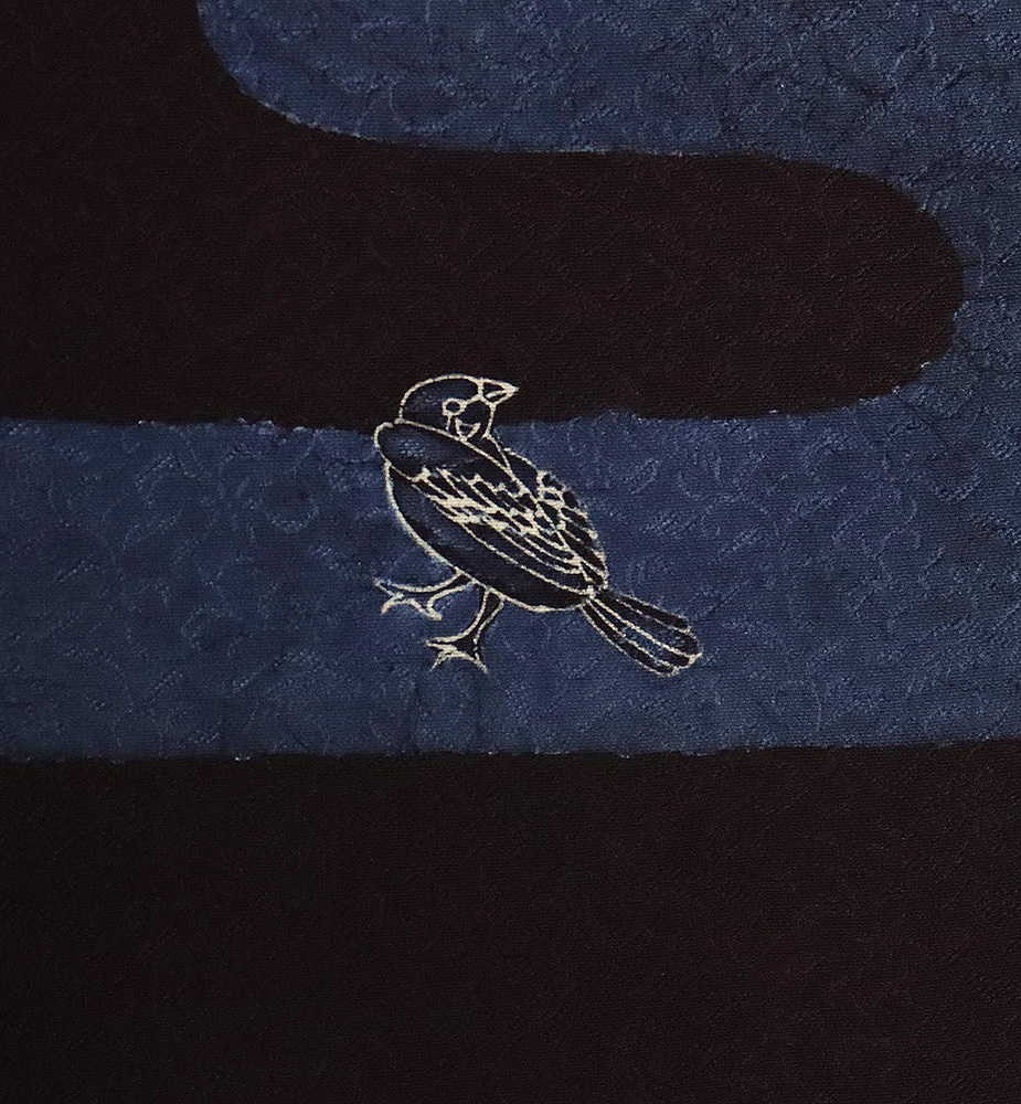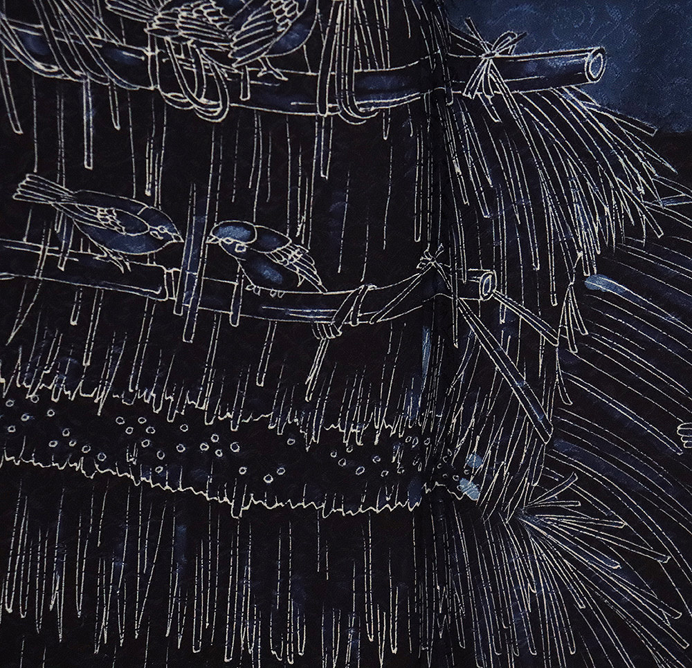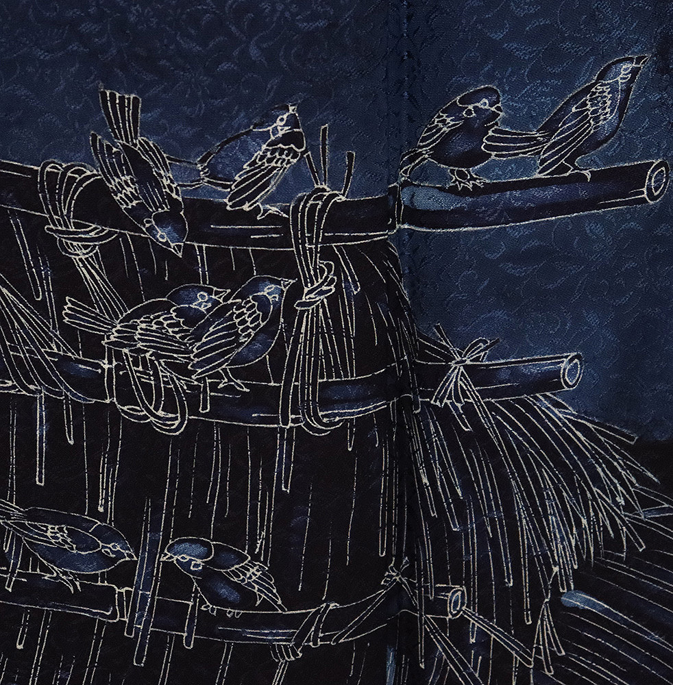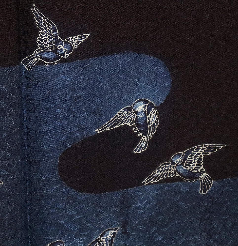 | 色・柄 | 藍染 佐藤阿波藍製造所 訪問着 袷 丹後縮緬地 濃紺(漆黒色)・紺(紺青色)・ 花蔓地模様地 スズメ (写真では上手く色が出ない場合があります。ご了承下さい) |