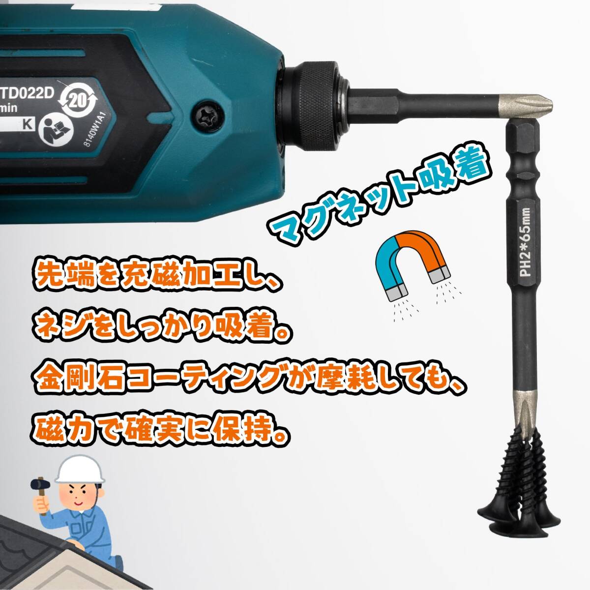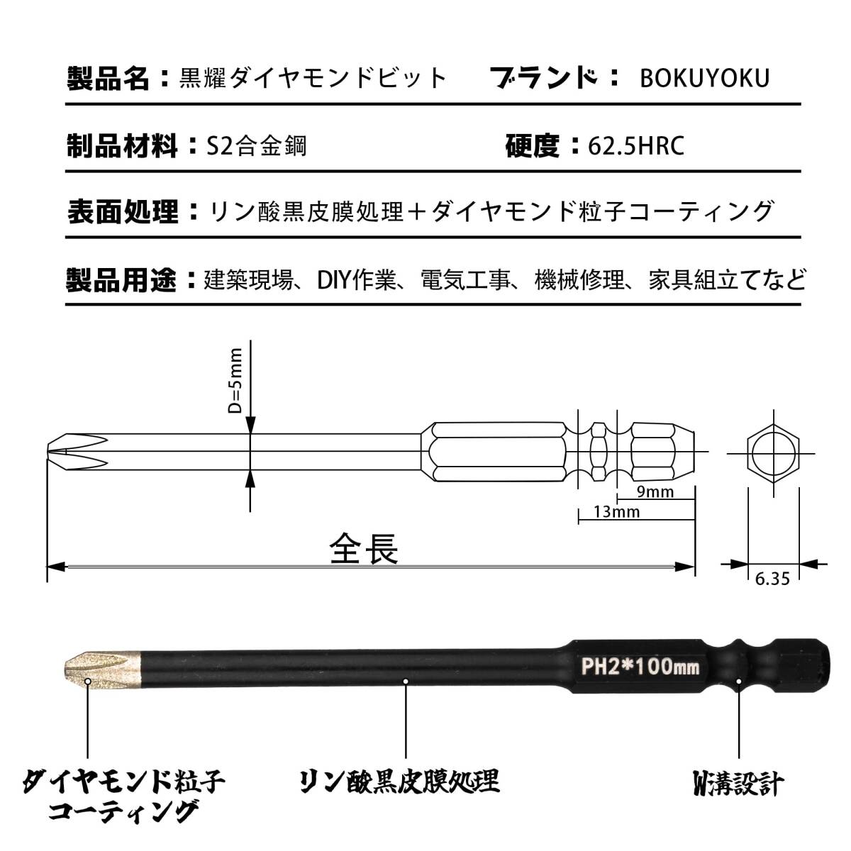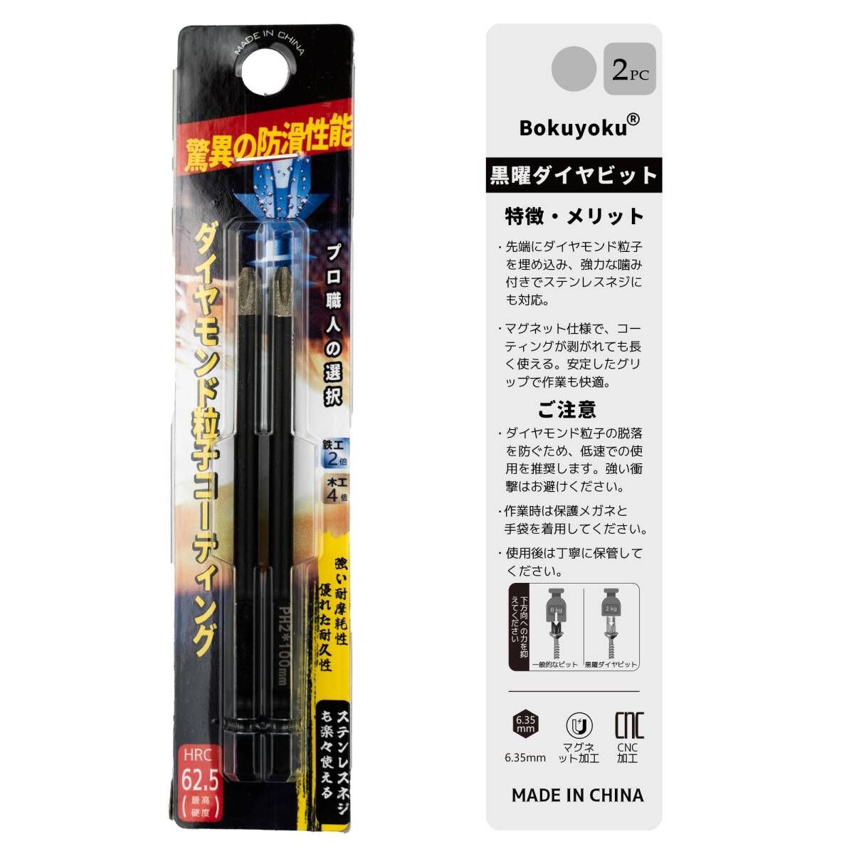 Bokuyoku ダイヤモンド黒曜ビット 防滑 強力食いつき W溝タイプ 日米インパクトドライバー対応 マグネット入り 6.35mm六角軸 電動ドライバービット 2本 (+2×100)