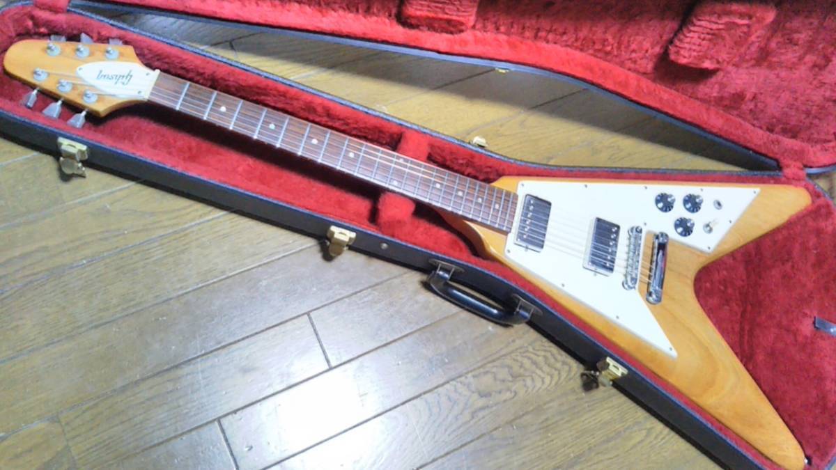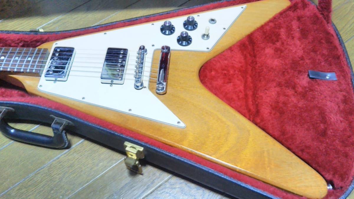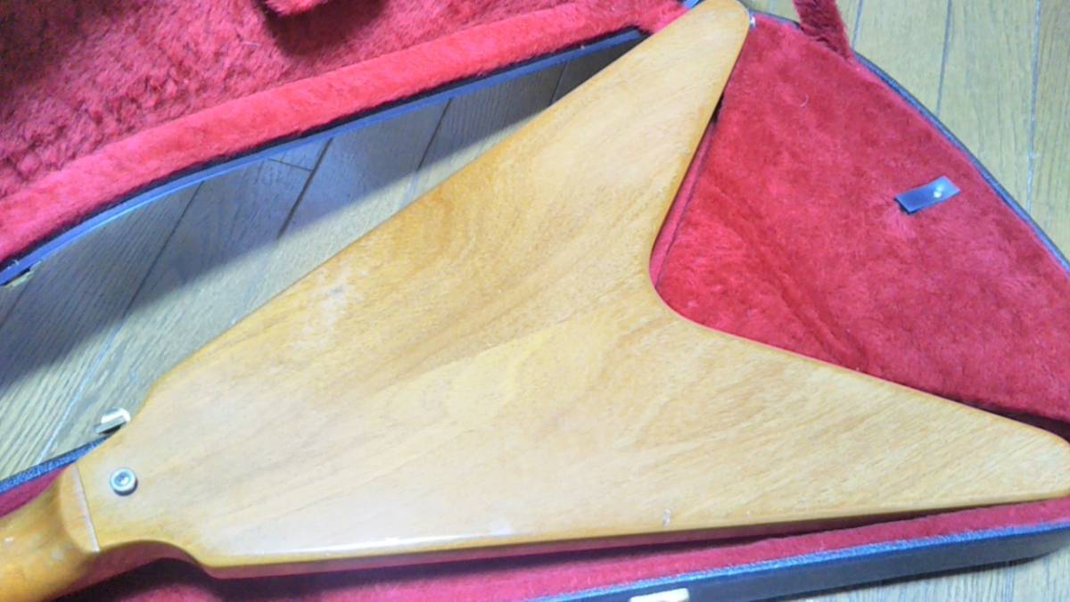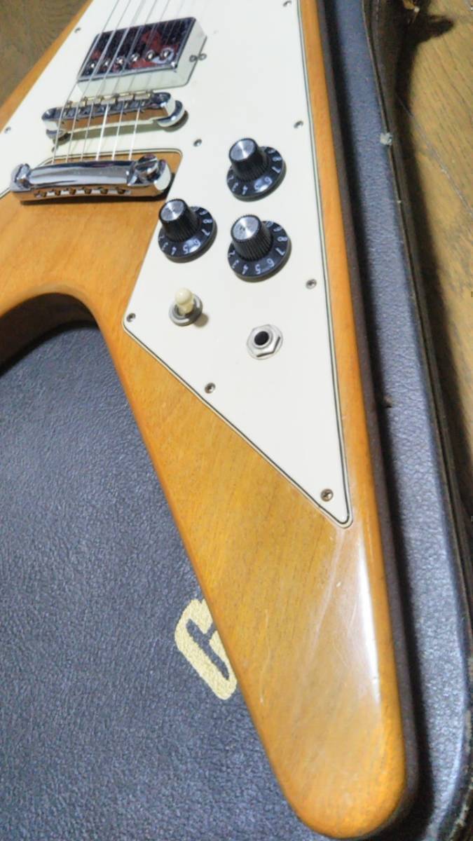★1980年製 Gibson フライングV ◆2Pマホガニーボディ。マホガニー材では珍しくかなり杢目がキレイに出た美しいレア・ギターです。この年代でのマホガニー材でも珍しい良材ですが、現行品のマホガニー等とは比べ様もない程の素晴らしい材です。●Pガードに以前にリアPU周りにエスカッションを付けたネジ穴跡があります(キレイに埋めてタッチアップしてありますので、少し離れて見ると目立たないと思われます※画像参照)他には、ネック周りやアッセンブリー関係を含むリペア跡やパーツ交換等は無いと思われます。又、楽器としての不具合もないと思われ、御落札後もリペア等の必要性もないかなりのGOODコンディションと思われます(年代なりの使用感や傷、バックルウェア(※画像参照)等はございます。それ故、ヴィンテージギター、中古ギターをよく御理解している方のみ御入札下さいます様お願い申し上げます)超軽量約2.98㎏!!OHケース付き。●いかなる場合もノークレームノーリターンでお願い致します。又、御落札後、24時間以内に御連絡、2日以内に御入金、商品到着後の当日中に速やかに御連絡可能な方のみとさせて頂きます。新規の方、日本語の通じない方もお断りさせて頂きます。