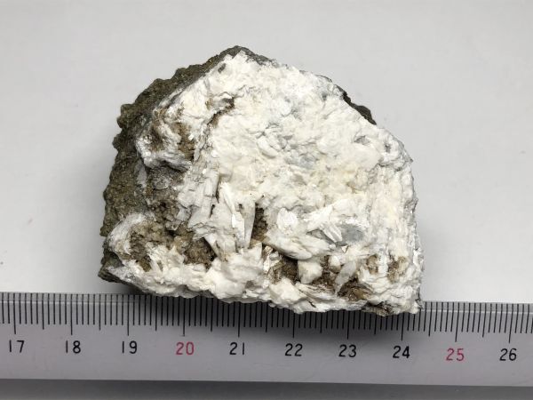 出雲市河下町濁沸石です。母岩の表面に白色柱状結晶の濁沸石が生成しております。また紫外線で弱い蛍光を示します。珍しい産地の沸石をお探しの方がおりましたら、この機会にいかがでしょうか。