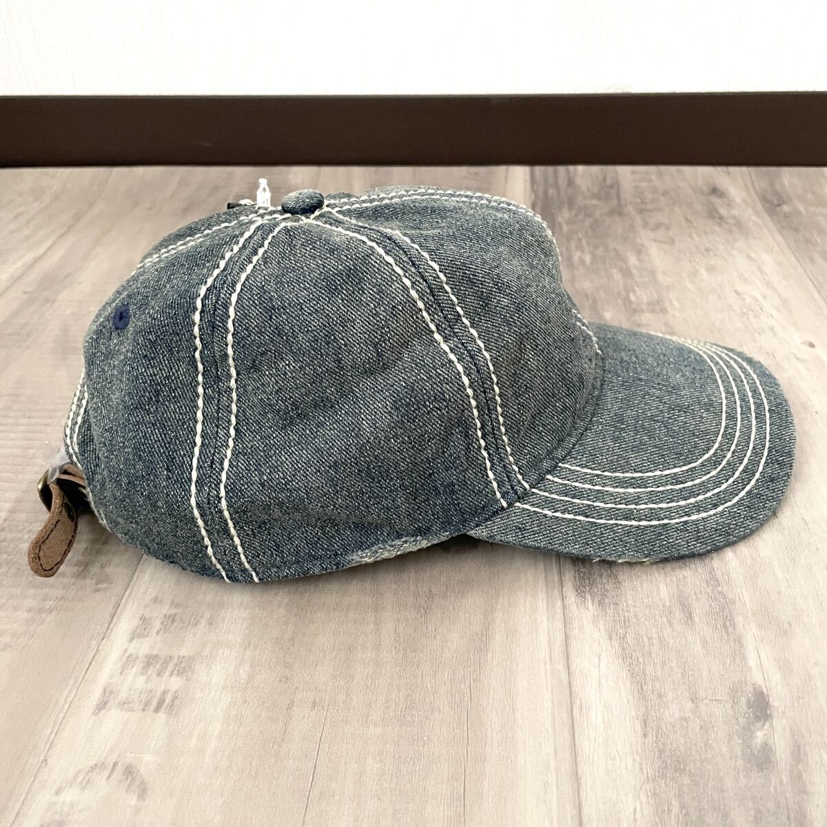 ステンシルプリントとダメージ加工が、デザインアクセントのデニムキャップです。