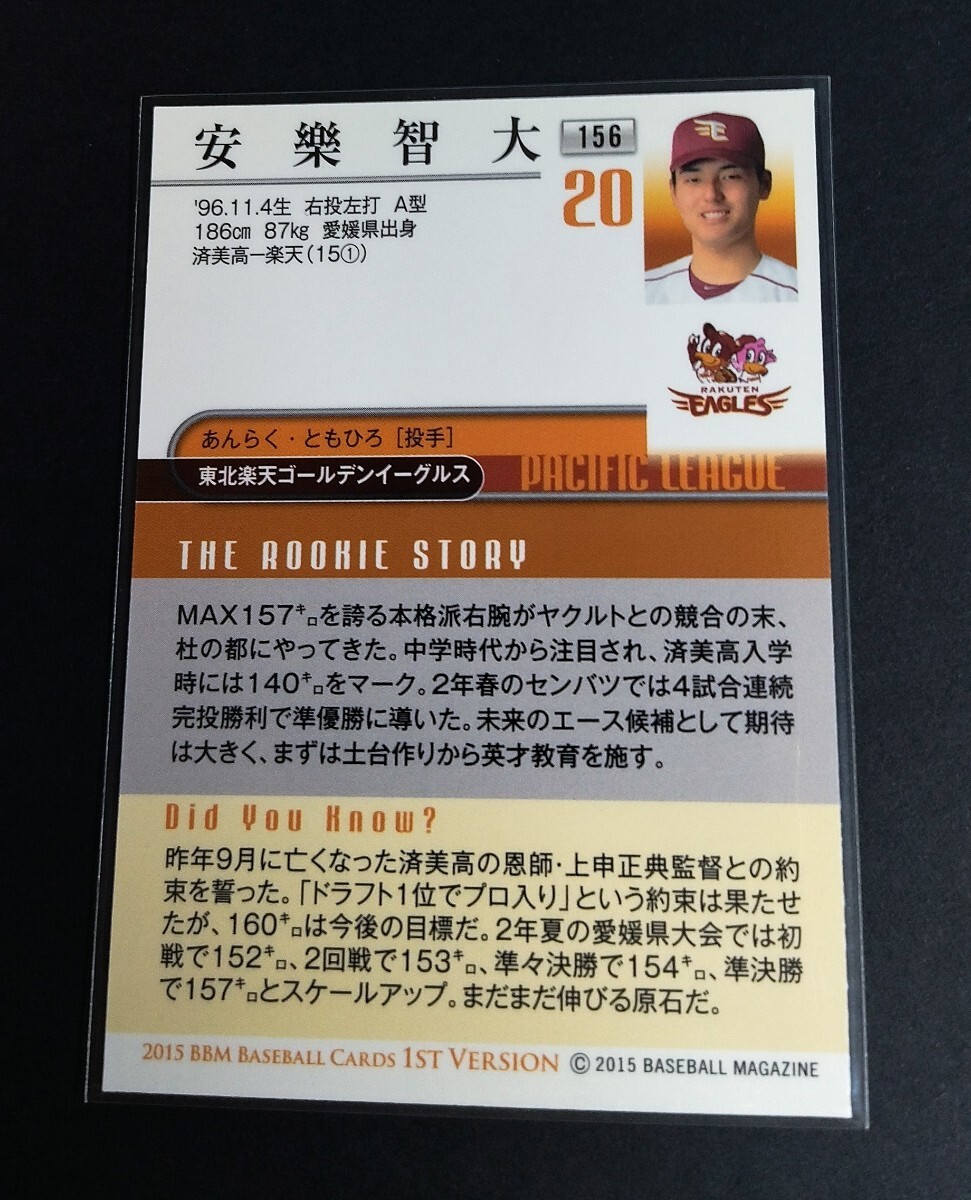 2015年BBM 1st 安樂智大(楽天)ルーキーカード!銀箔サイン入り!No,156。