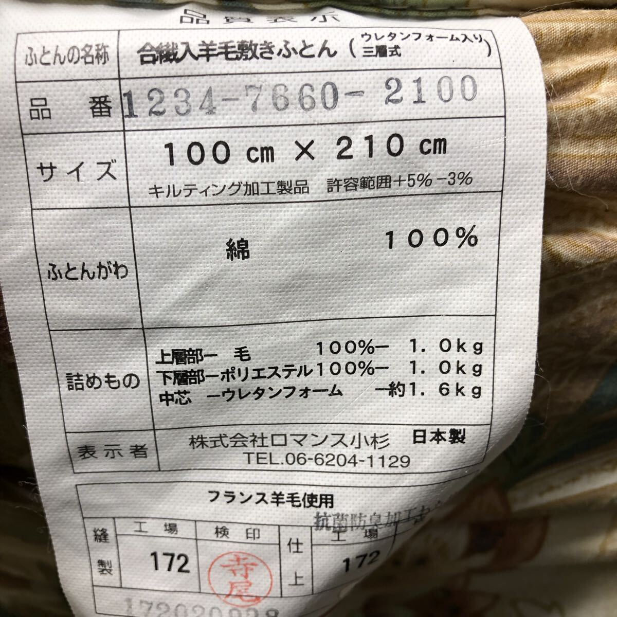 ロマンス小杉 合繊入羊毛敷き布団 ウレタンフォーム入り三層式 敷布団 シングル 3.6kg 固綿 100×210cm です。