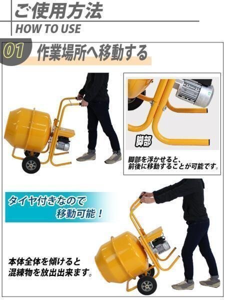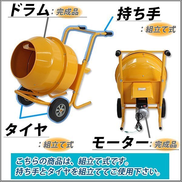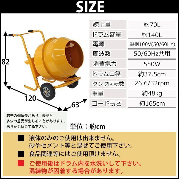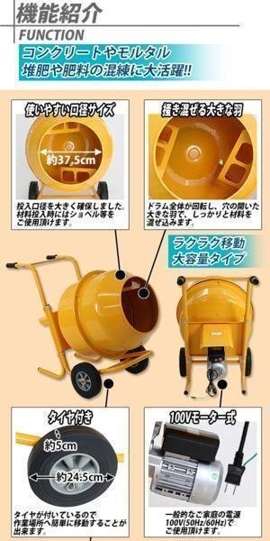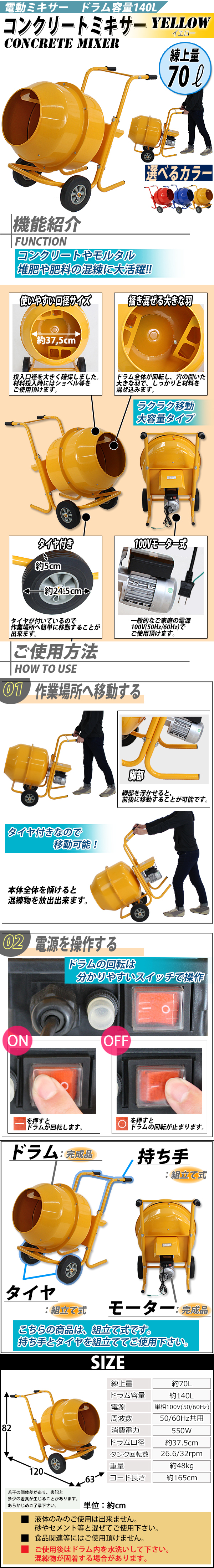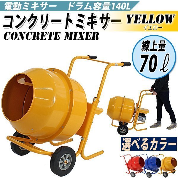 | 商品名 | コンクリートミキサー 黄 練上量70L ドラム容量140L 電動 モーター式 100Vモーター 混練機 攪拌機 かくはん機 コンクリート モルタル 堆肥 肥料 飼料 園芸 タイヤ 車輪 キャスター ミキサー 攪拌 かくはん 混錬 混ぜる 練る イエロー YELLOW |