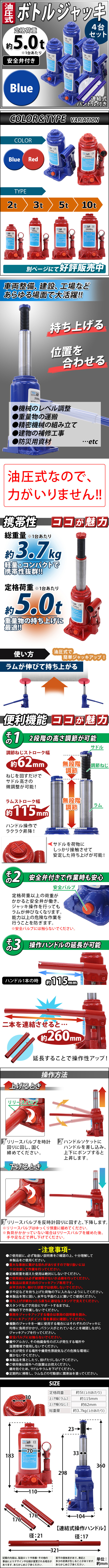 | 商品名 | 送料無料 油圧式 ボトルジャッキ 定格荷重約5t 約5.0t 約5000kg 4台セット 4個 油圧ジャッキ だるまジャッキ ダルマジャッキ ジャッキ 手動 安全弁付き ジャッキアップ タイヤ交換 工具 小型 軽量 車載用 車 整備 修理 メンテナンス 工場 作業 ブルー bjackt4065t4p |