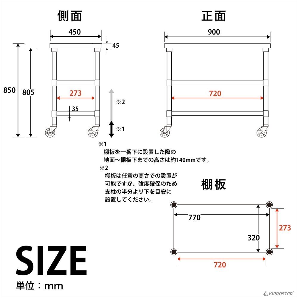 | 材質 | 天板:ステンレスSUS430 脚:ステンレスSUS201 梁:スチール 車輪:PU 軸受:スチール亜鉛メッキ |