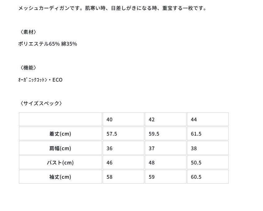 | 参考サイズ | M (40) : L (42) : LL (44) (サイズ変更不可) |