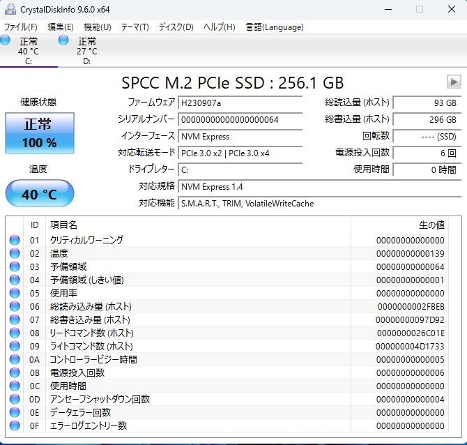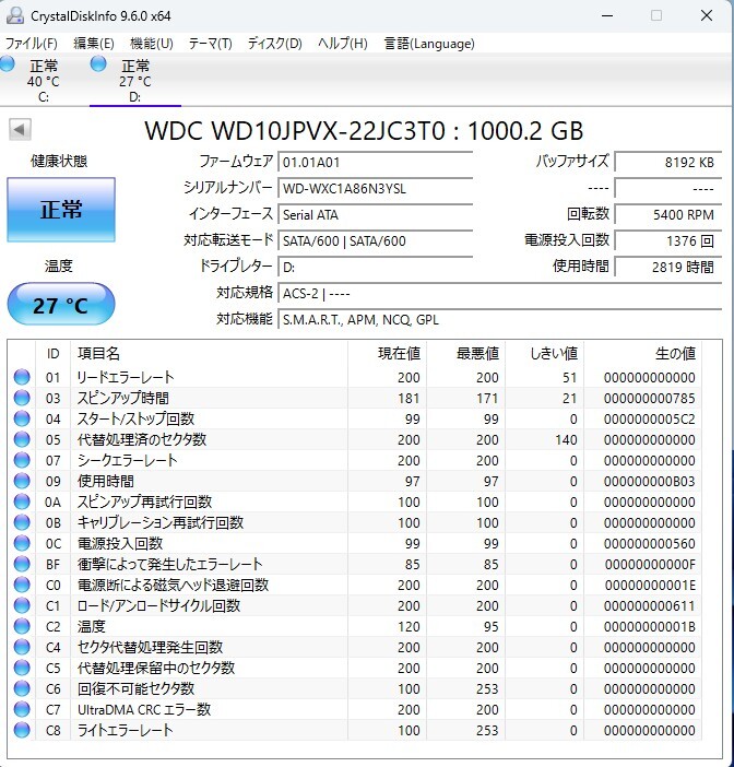 1TB 診断結果:正常、電源投入回数:1,380