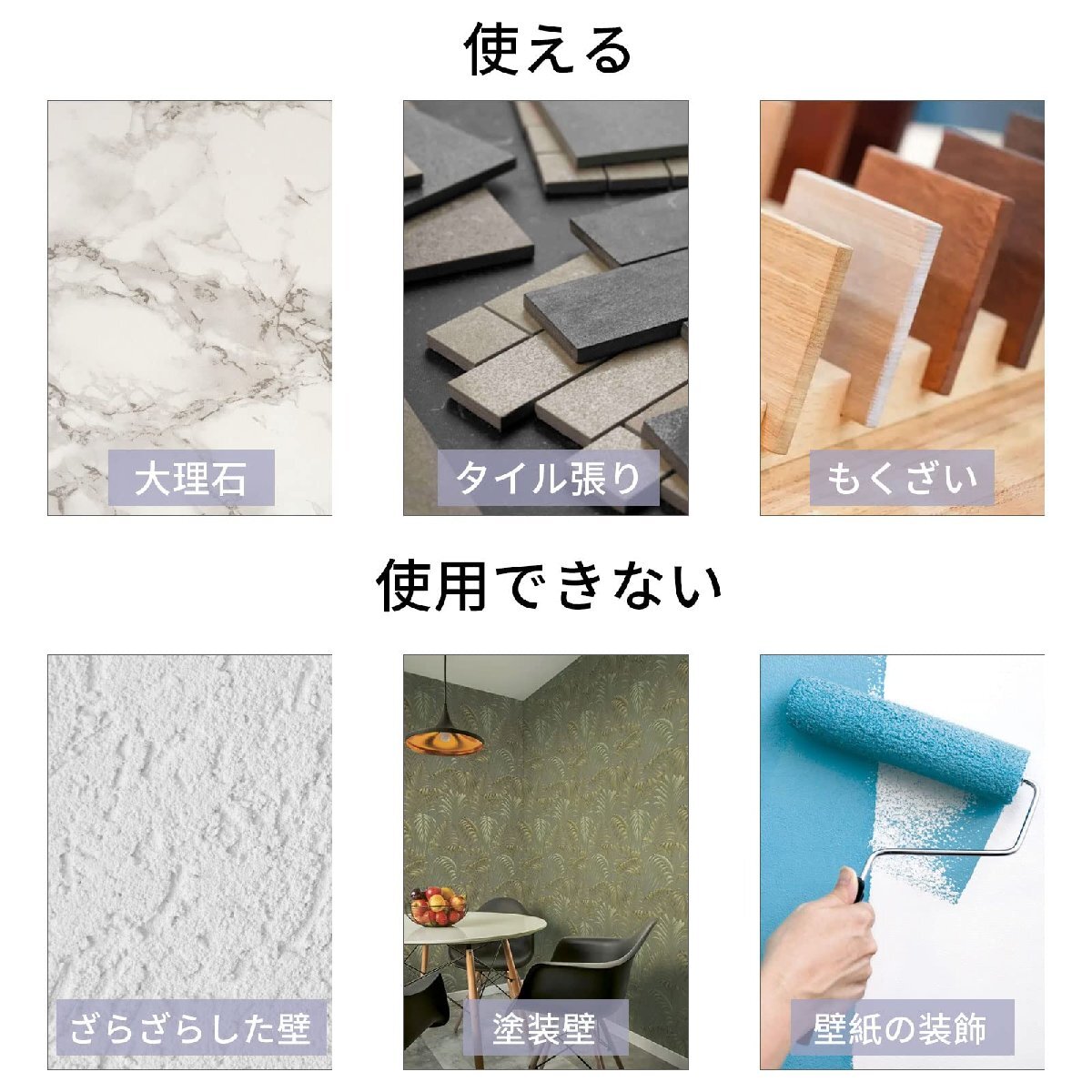 【適用壁面】接着剤フックは、ガラス、タイル、滑らかな木材、金属、ステンレス、平板大理石などの滑らかな硬い表面にしか適用できない。注意:隙間、タイル継ぎ目、または多孔質の壁に貼り付けると、フックの積載能力が低下します。