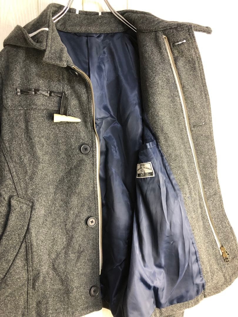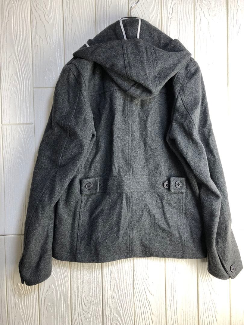 グレーのダッフルコート、フード付きで防寒性に優れています。