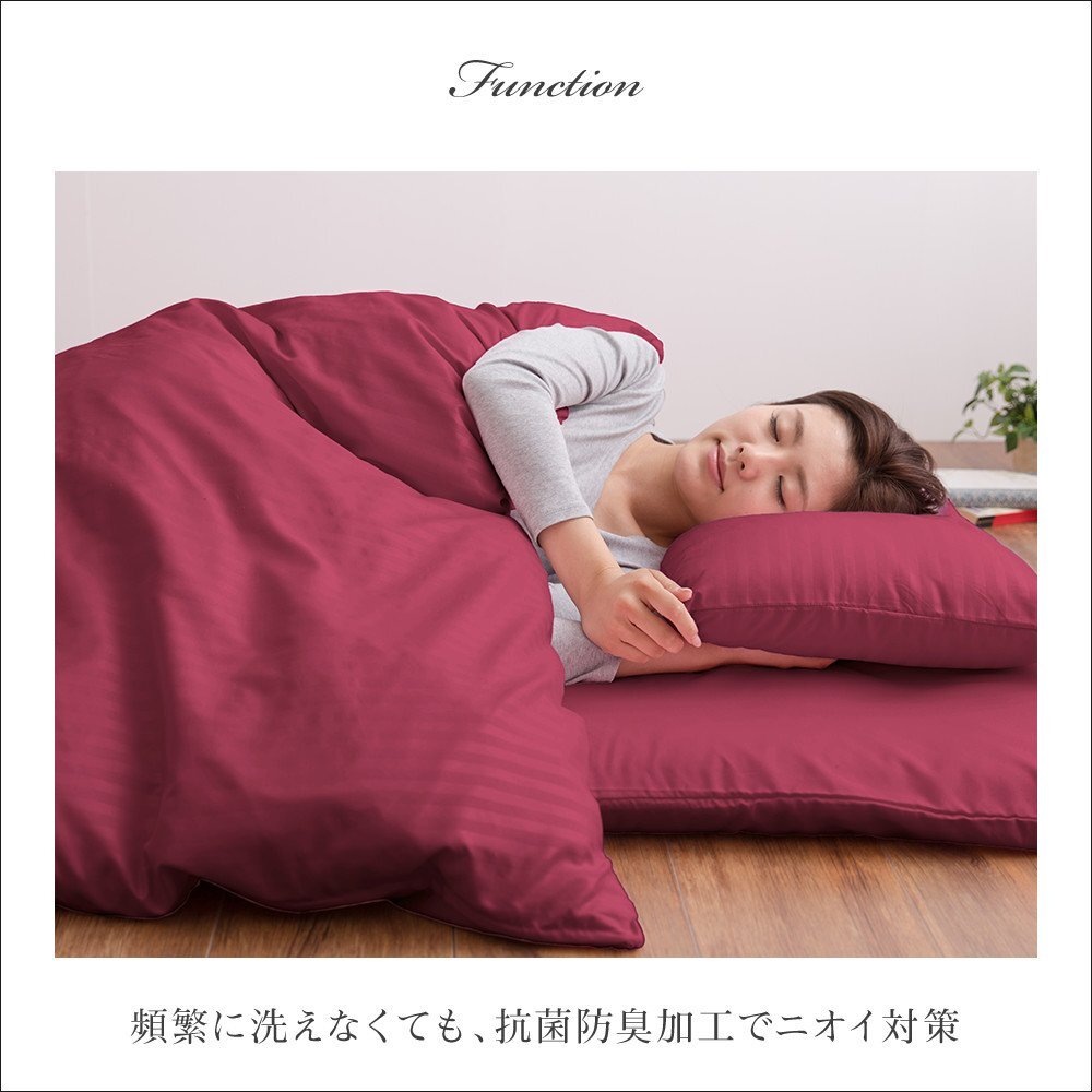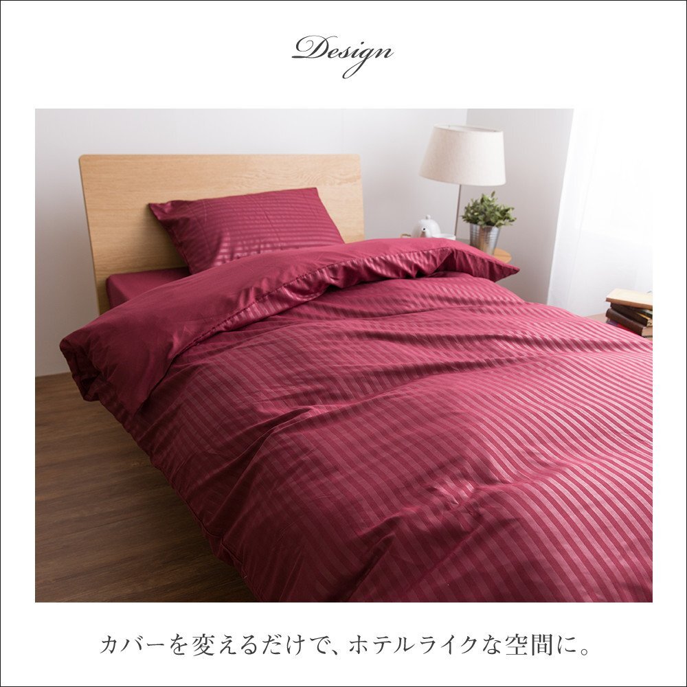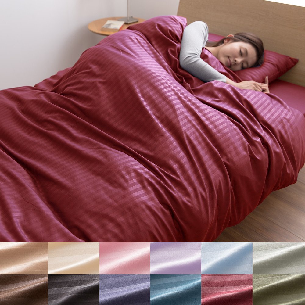 シンプルなストライプなのに・・ どこか高級感が漂う【ホテルタイプ 布団カバー3点セット】。 サテン調生地に、エンボス加工のストライプを描いたことで、 ただのストライプとは違う、上質な雰囲気を表現できました。 寝室は、人に見られる事もないし・・と、 寝具のカバーがチグハグな方も多いのでは・・ この機会に【ホテルタイプ 布団カバー3点セット】に変えて、 すっきり、模様替えしませんか 3点セットだから、統一感のなかった寝室から一変。 まとまりがあり、高級感のある寝室へ。 今お使いの寝具が、ベッドでも、敷き布団でも、 ベッド用、敷き布団用、2タイプご用意いたしましたので、 あなたの寝室に合わせてお選びください。 こだわりは、見た目だけではありません。 お手入れが面倒な、寝具。 頻繁に洗えない方でも、安心してお使い頂けるように、 抗菌防臭加工をプラスしました。 また、天気のタイミングを見てからじゃないと出来ない、大物の洗濯。 【ホテルタイプ 布団カバー3点セット】は、「部屋干し臭防止加工」をする事で、 梅雨でも、冬でも、天気を気にせず洗濯できます。 カラーバリエーションも豊富な12カラーをご用意。 どのカラーも品のあるカラーに仕上げました。 タイプは敷き布団用と、ベッド用の2種類をご用意いたしましたので、 今お使いの寝具に合わせてお選びください。 デザインだけではなく、使いやすさも考えた【ホテルタイプ 布団カバー3点セット】。 高級感がありながらも、お求め安い価格も実現することができました。 ホテルのような寝室で、毎日気持ちよく、眠りにつきませんか。