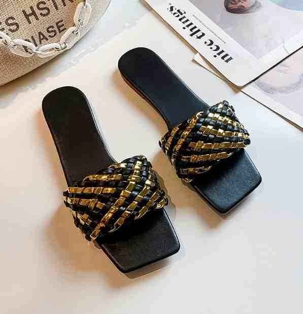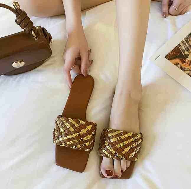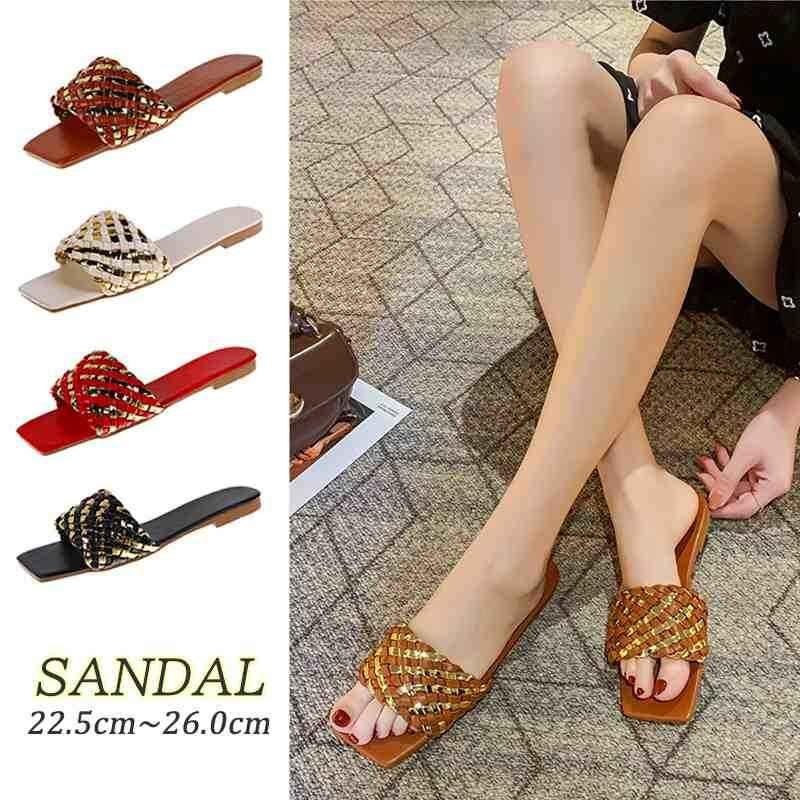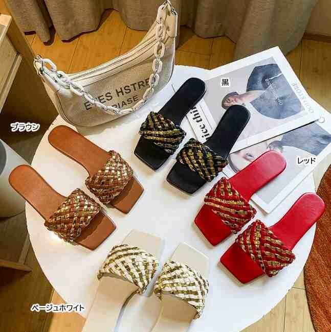 高見えするゴールドの編み込みサンダル