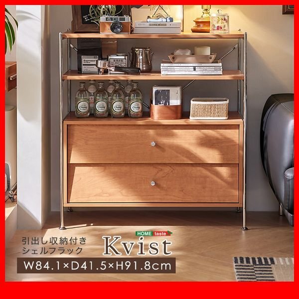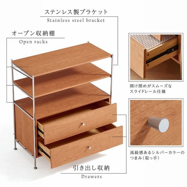 引出し収納付きシェルフラック! ステンレスとナチュラルな木目の組み合わせがスタイリッシュで、お部屋の雰囲気をおしゃれに引き上げてくれます。 大容量の引き出しが2個付いているので、収納力もばっちりです。 |