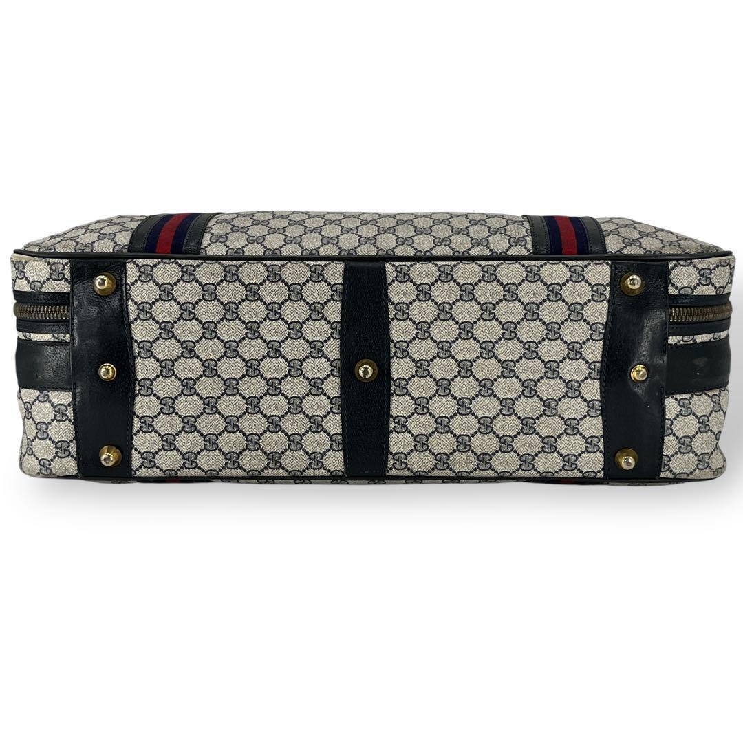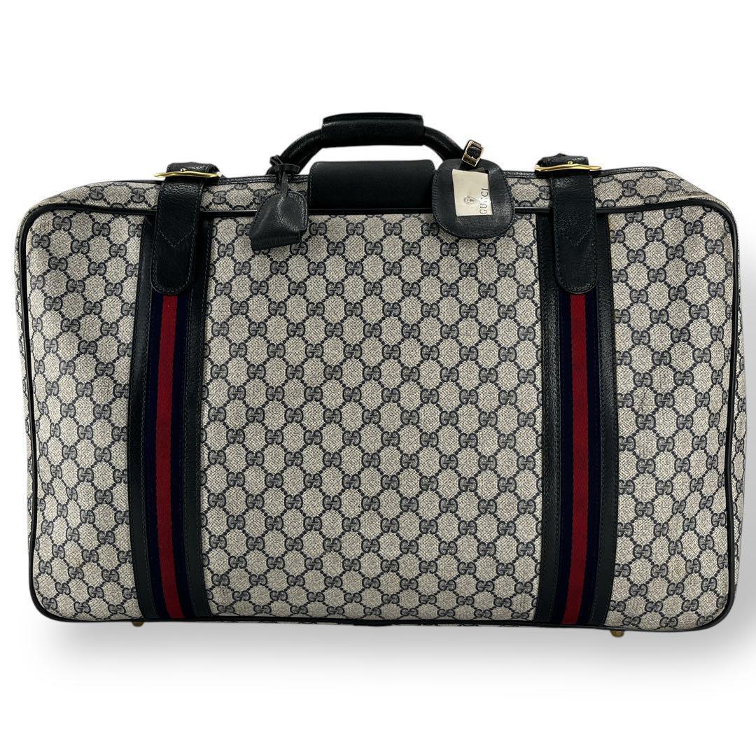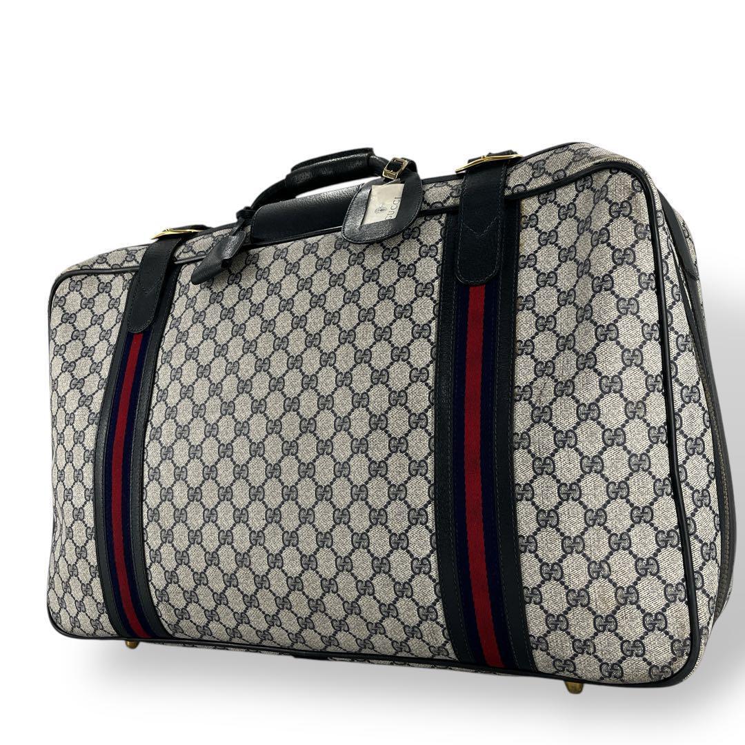 OLD GUCCI ヴィンテージ ビンテージ PVCレザー グレー 紺 ネイビー ゴールド金具 ロゴ刻印 ネームタグ 南京錠 ベルト バックル 旅行カバン トラベルバッグ 大容量
