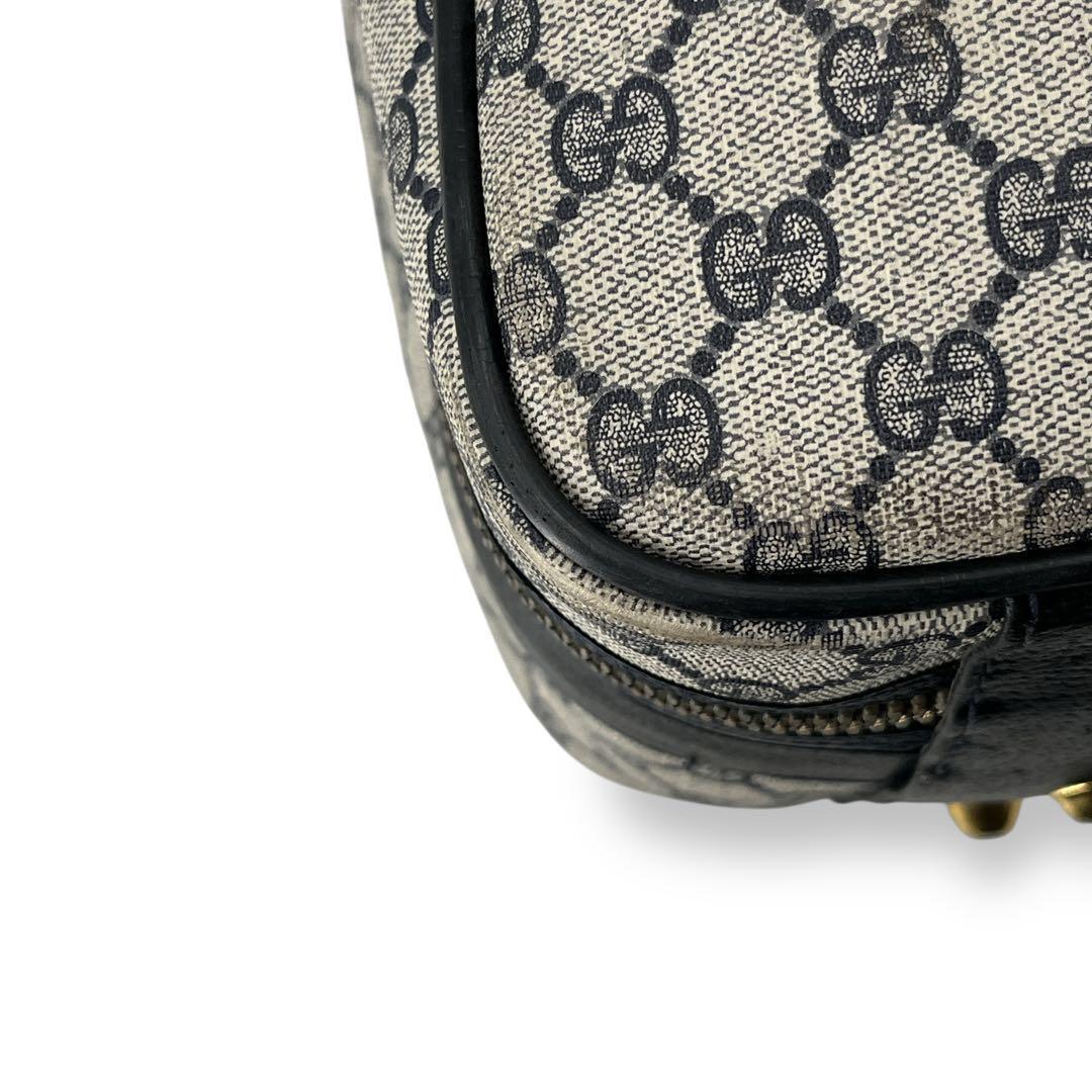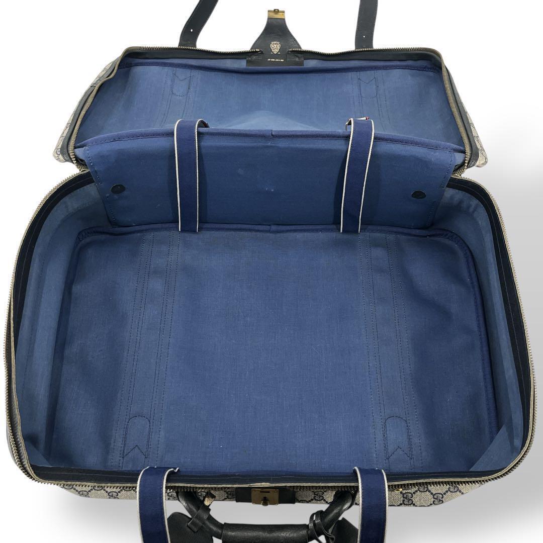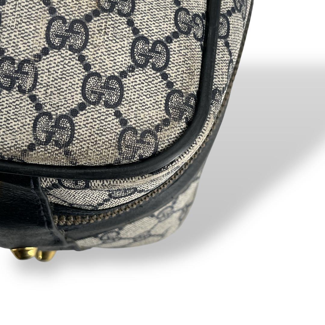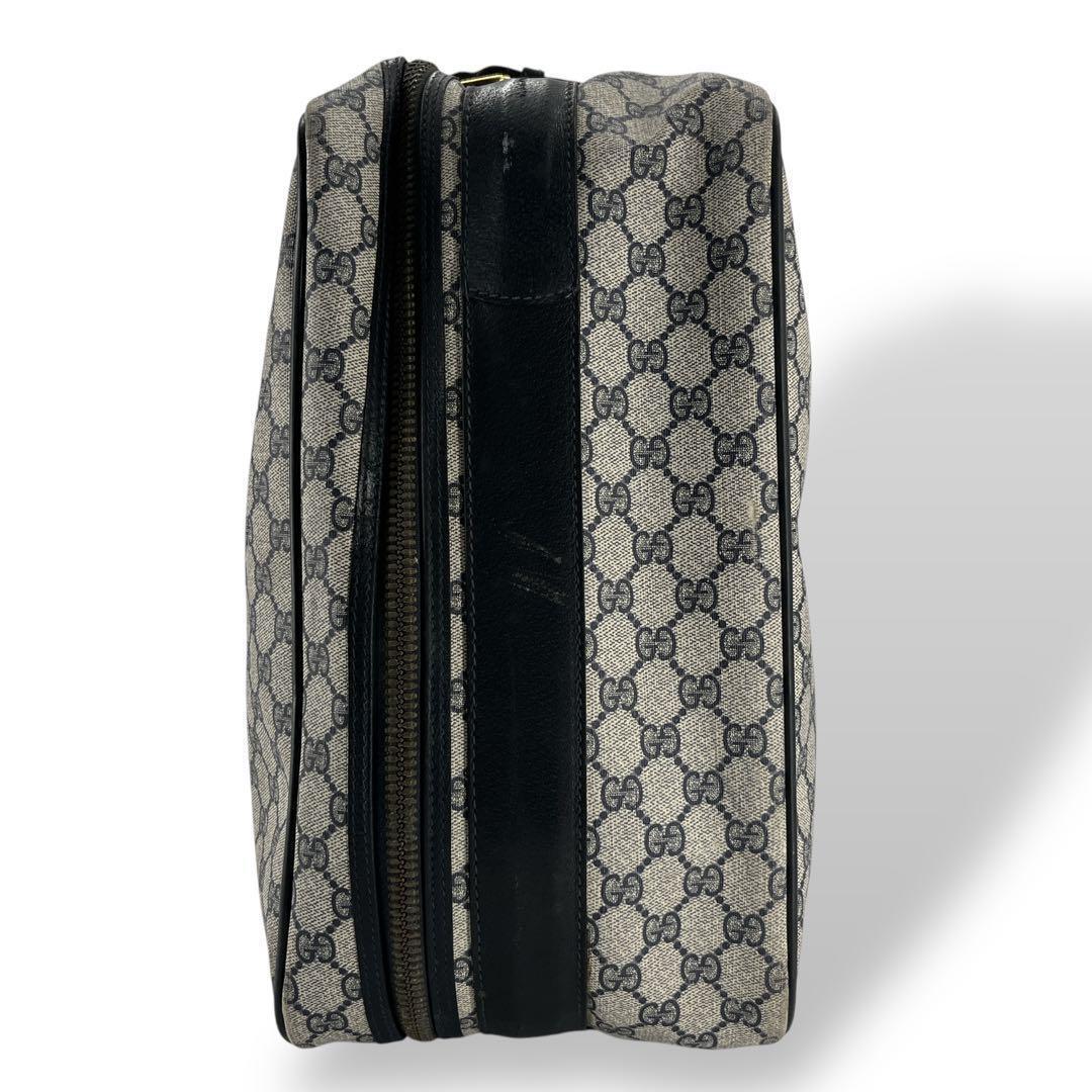 OLD GUCCI ヴィンテージ ビンテージ PVCレザー グレー 紺 ネイビー ゴールド金具 ロゴ刻印 ネームタグ 南京錠 ベルト バックル 旅行カバン トラベルバッグ 大容量