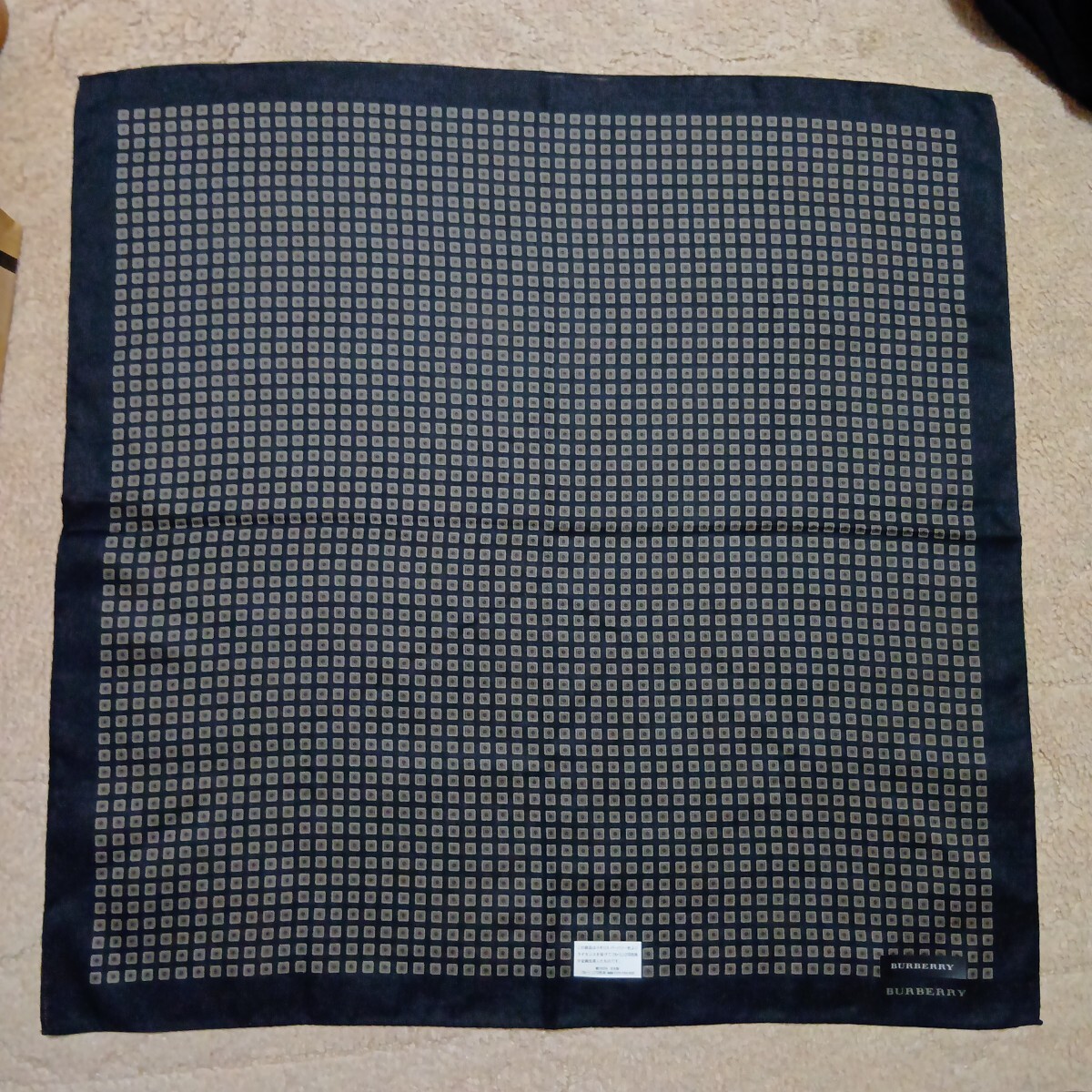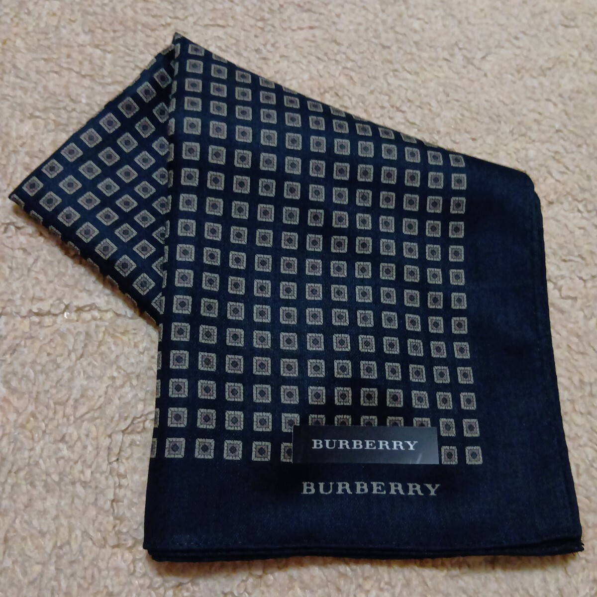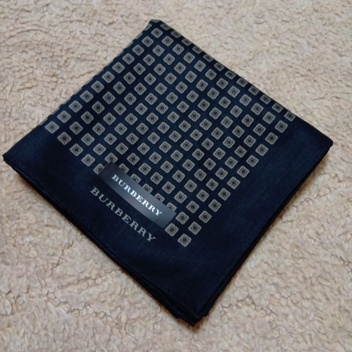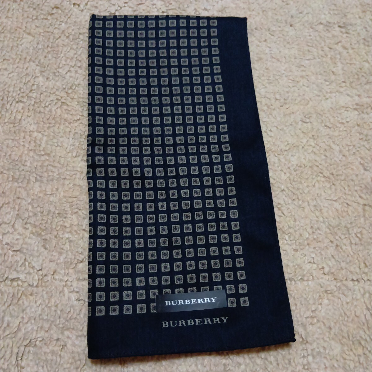 BURBERRY黒地に茶ベージュ系の四角柄総柄で、1角ロゴネーム印刷あります。手触り滑らかです。上質良品美品です。シール付きです。
