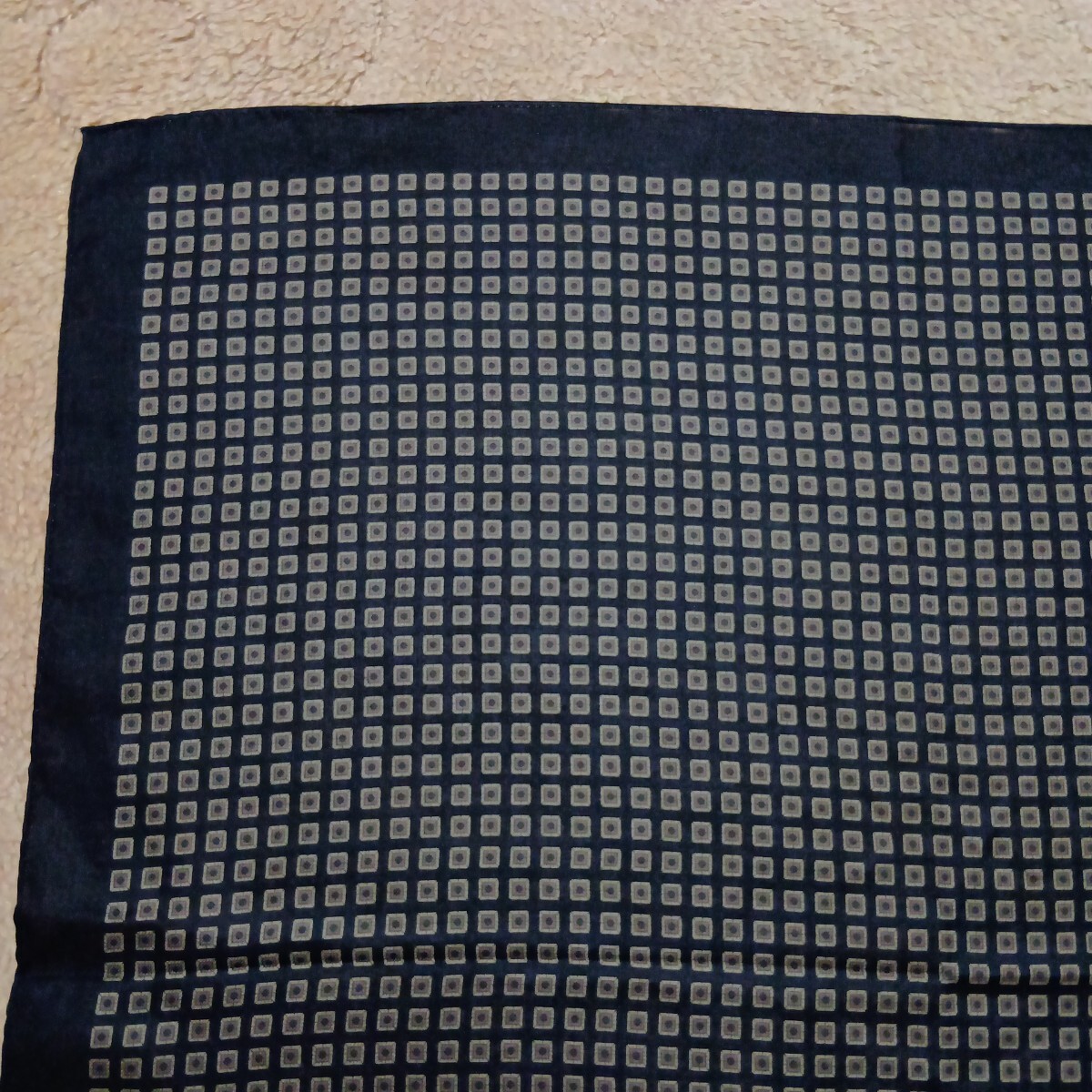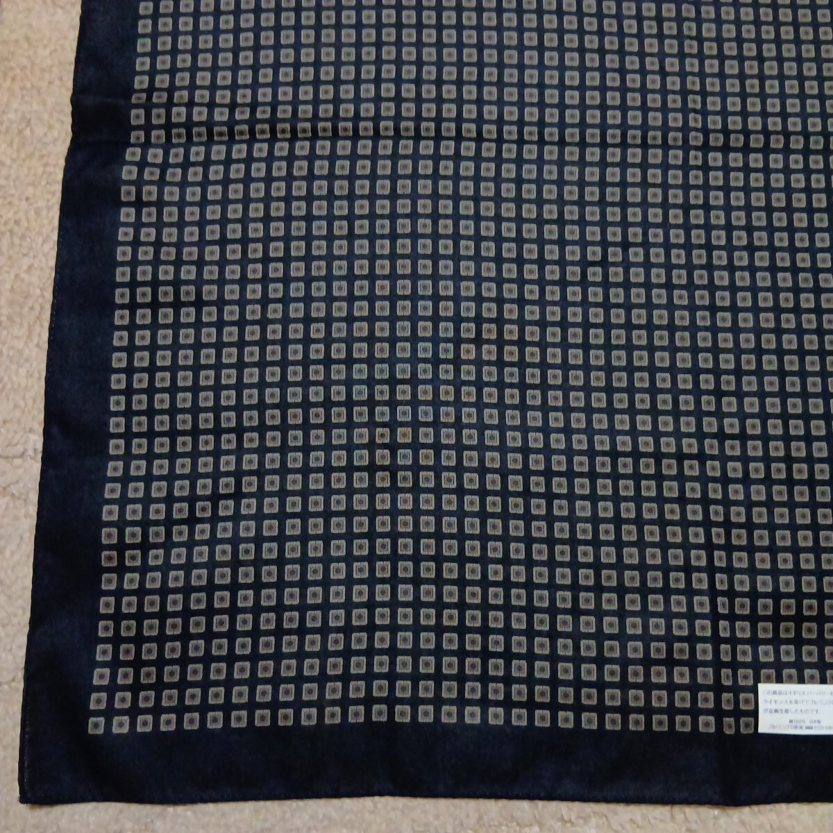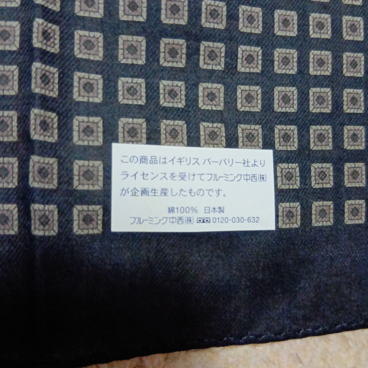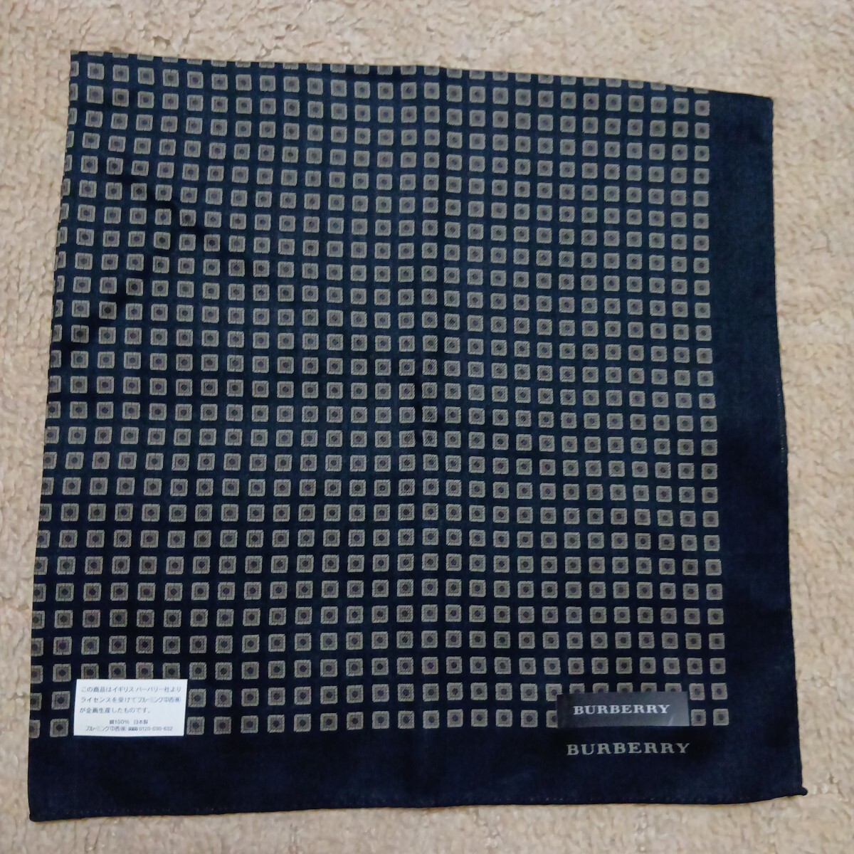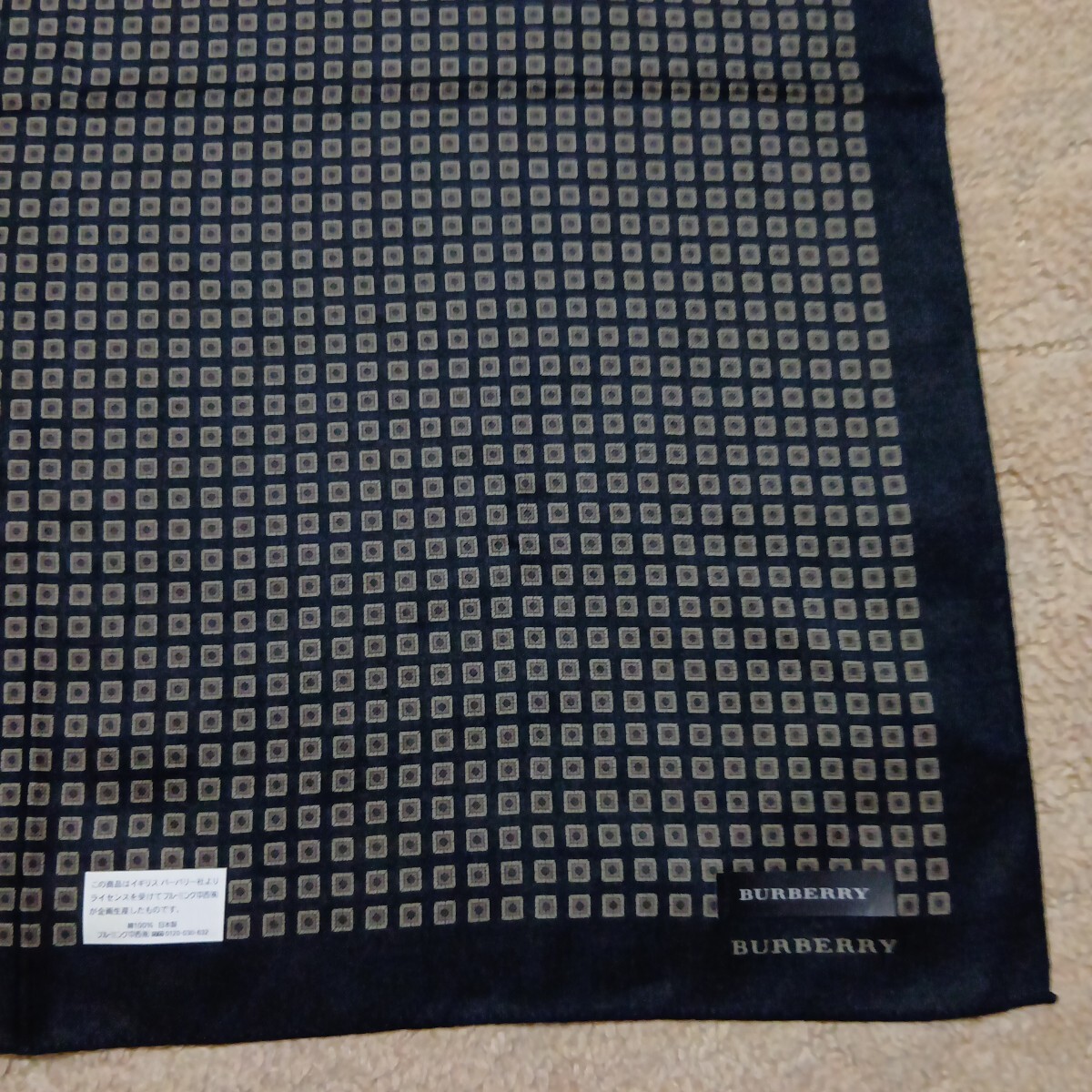 BURBERRY黒地に茶ベージュ系の四角柄総柄で、1角ロゴネーム印刷あります。手触り滑らかです。上質良品美品です。シール付きです。