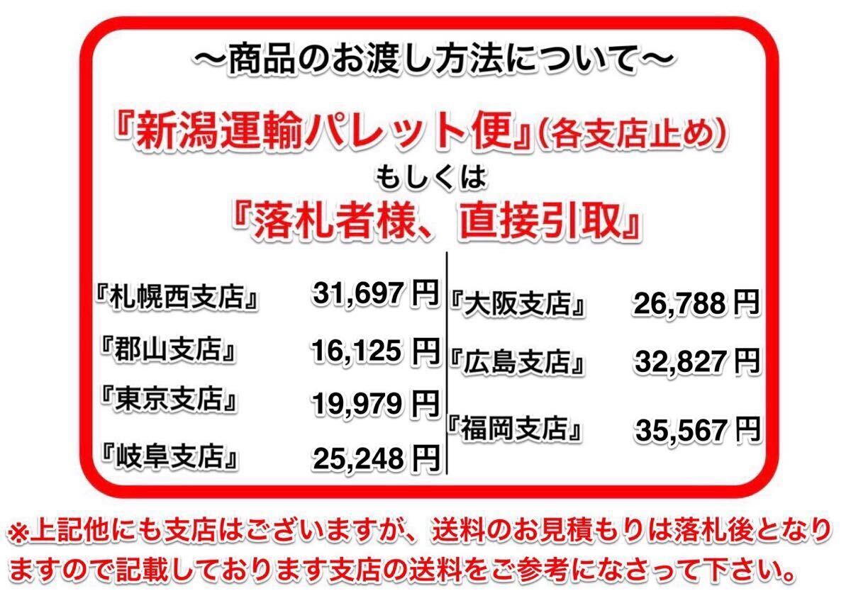 『落札者様、直接引取り』もしくは『新潟運輸パレット便』 ■落札者様、直接引き取りの場合 イワテケンオウシュウシイサワオヤマリュウガババ ※商品の保管場所は岩手県奥州市水沢胆沢小山龍ケ馬場63-1になります。 ※定休日は毎週水曜日となります。 ◇ヤフオクの直接引き取り対応可能時間は9:00~16:00です。 ※担当者が不在の場合がございますので、お引き取り日時がお決まりになりましたら取引ナビ『メッセージ』にて、前日までにご連絡をお願い致します。 ※前日までにお引き取り日時をお知らせいただけましたら、積込みのお手伝いを致します。 ※トラブル防止の為、お引取りは日本語のできる方に限らせていただきますので、予めご了承ください。 ※新型コロナウイルス感染予防対策として、お引取りの際はマスク着用のご協力をお願い致します。 ■新潟運輸パレット便(各支店止め)の場合 ※大型商品(一人で持てない物・佐川急便での発送サイズを超過している物)の発送はパレット便『各営業所止め』・『元払い』での発送となります。 ※企業や法人でフォークリフトが完備されている場合は、会社まで発送できます。 但し、フォークリフトがある場合でも個人宅へは配達できません。(すべて各営業所止めとなります。)ご納得できない方は、トラブルが起きてしまう可能性がありますので絶対にご入札なさらないでください。 ※他の運送会社はお取り扱いしておりません。基本的にパレットに固定しての発送になりますが、場合により使用しないこともあります。 パレットを使用しない判断は当方での判断とさせていただきます。ご落札者様の希望はお受け出来兼ねますのでご了承ください。 ※配送料は、落札後のメッセージにて確認していただきます。その際に送り先の市町村をお知らせ下さい。 【例】○○県○○市○○町 →群または県までですとお見積もりができません。 ※※現在送料の見積もり依頼を多数寄せられている為、大変申し訳ありませんがお見積りは落札後に限らせていただきます。 お見積りにご納得いただけない場合はお手数ですが、落札者様ご自身で陸送会社さんの手配をお願い致します。 ※送料は『元払い』のみでの取り扱いです。『着払い』はお受けできません。 ※全ての出品物をID番号にて管理しておりますので、同梱包は不可になります。 ※営業所が近くに無い場合もありますので、必ずご質問の上ご確認ください。 ※沖縄・離島へは発送できません。 ※商品が到着しても、支店によって落札者様への到着連絡がない場合がございます。 ※発送連絡の際に『お問合せ番号』をお知らせしますので、そちらの番号にてご確認をお願い致します。 ※梱包サイズを小さくする為に多少の分解は致します。 ※商品到着後、発送に使用したパレットは落札者様にて処分下さい。 ※※天候(冬期は積雪)により、発送までのお時間をいただく場合がございます。 お急ぎの方はご注意くださいますようお願い致します。 ※※お取引きをスムーズにする為に上記の送料を参考にしていただけると幸いです。 ~送料概算~ (見積もりは落札後となりますので、参考程度にお考え下さい) 『札幌支店止め』…31,697円 ※北海道への発送は、札幌自動車運輸となります 『郡山支店止め』…16,125円 『東京支店止め』…19,979円 『岐阜支店止め』…25,248円 『大阪支店止め』…26,788円 『広島支店止め』…32,827円 『福岡支店止め』…35,567円 ※上記他にも支店はございますが、送料のお見積りは落札後となりますので記載しております支店の送料をご参考になさってください。 ※運送会社様の都合や災害、震災などによりお荷物のお届けに遅れが生じる場合がございます。予めご了承ください。 | |