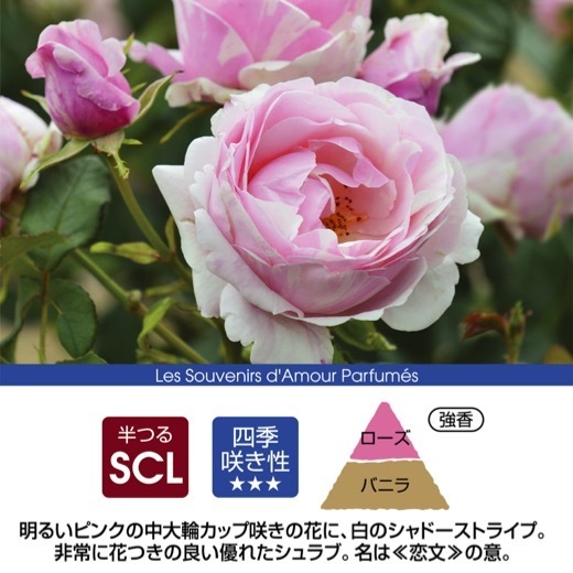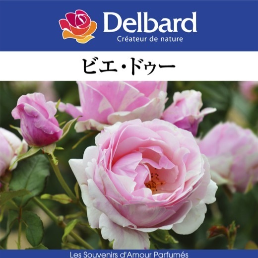 明るいピンクの中大輪カップ咲きの花に、白のシャドーストライプが個性を引き立てる。ローズとバニラの甘くやさしい香り。非常に花つきの良い優れたシュラブで、四季咲きショートクライマーとしてアーチやトレリス仕立てにも向く。耐病性も極めて強い。ビエ・ドゥーは≪恋文≫の意。