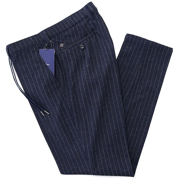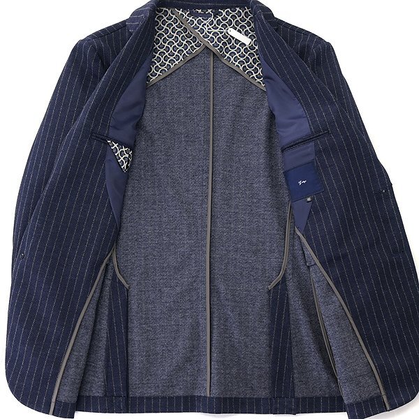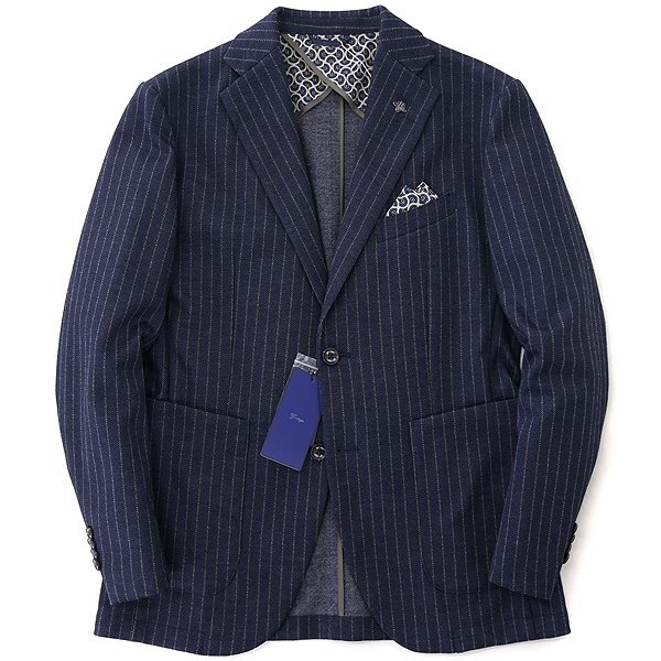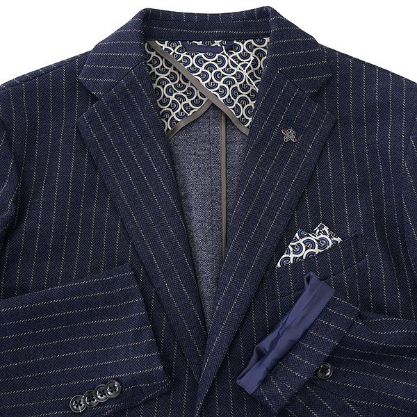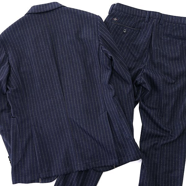 44サイズ(Sサイズ相当・画像は別サイズで撮影) ※商品に記載されたサイズ・寸法です※ 【ジャケット】 肩幅44cm 身幅50cm 袖丈60.5cm 着丈70.5cm 【スラックス】 ウエスト実寸78~83cm(内回り1周・ゴム入り) 股上24cm 股下74cm 裾幅16cm 腿幅27cm(股下10cm部分) ※伸縮性がある素材のため多少誤差が生じることがあります※ 表地:ポリエステル65% 毛24% 綿11% 背裏:綿100% 裏地:ポリエステル100% ネイビー×グレージュ系 |