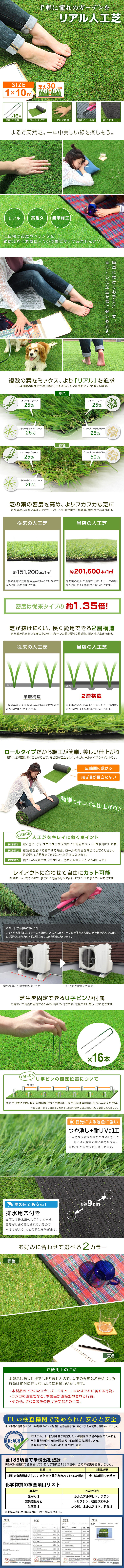 | 素足で歩きたくなるやわらかさ。 ロール状の人工芝です! 本物の天然芝と見間違えるほどのリアル感!! 人工芝なので枯れる心配も無ければ、メンテナンスもほぼ不要。 年間を通してきれいな緑が素晴らしい景観を保ちます。 水抜き穴が空いているので水が溜まる心配はありません。 はさみ等で簡単にカットすることが可能です。 固定に使えるU字ピン付き! 芝生のズレをしっかり防いでくれます♪ |