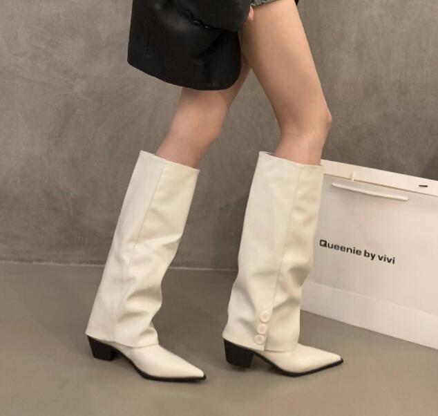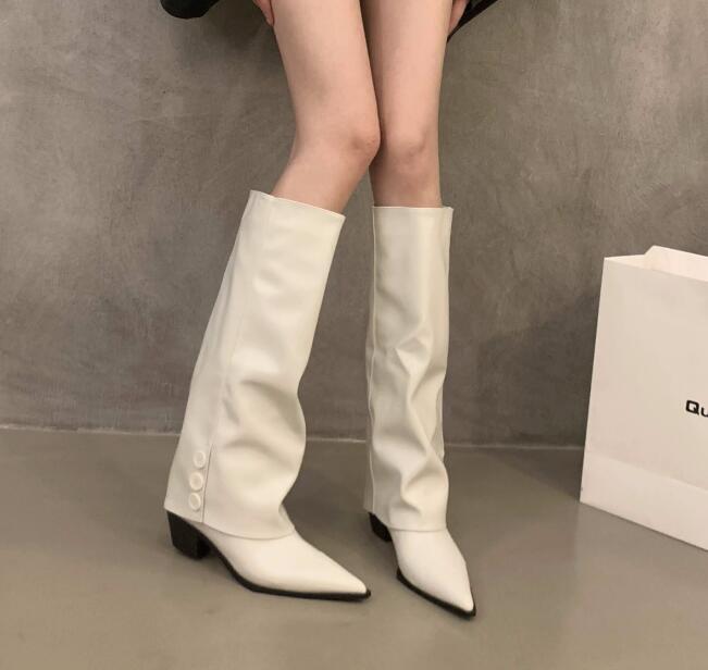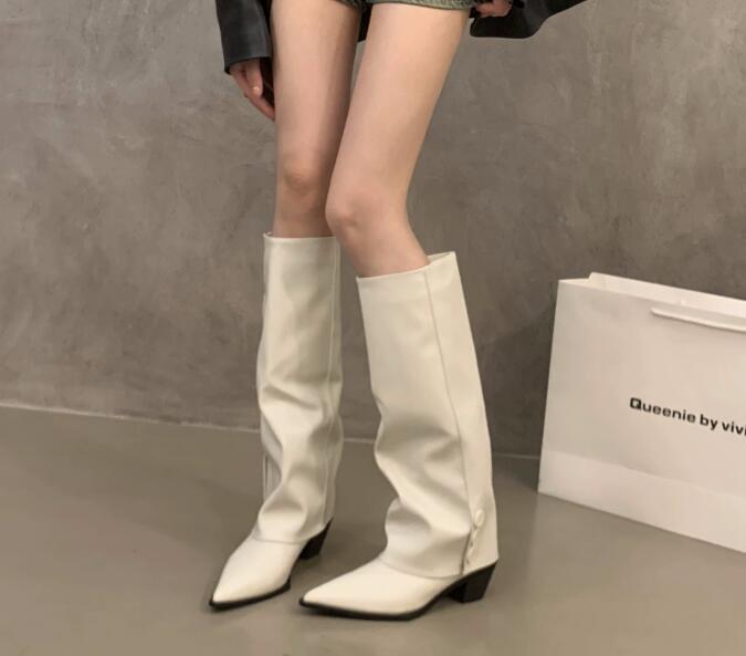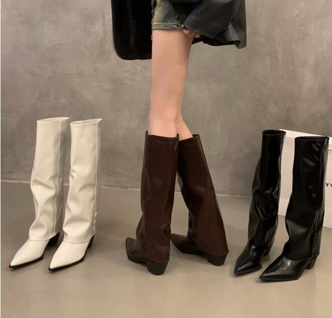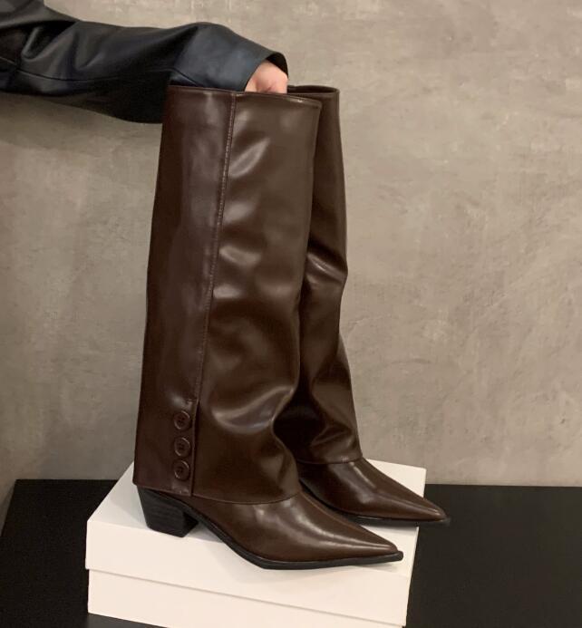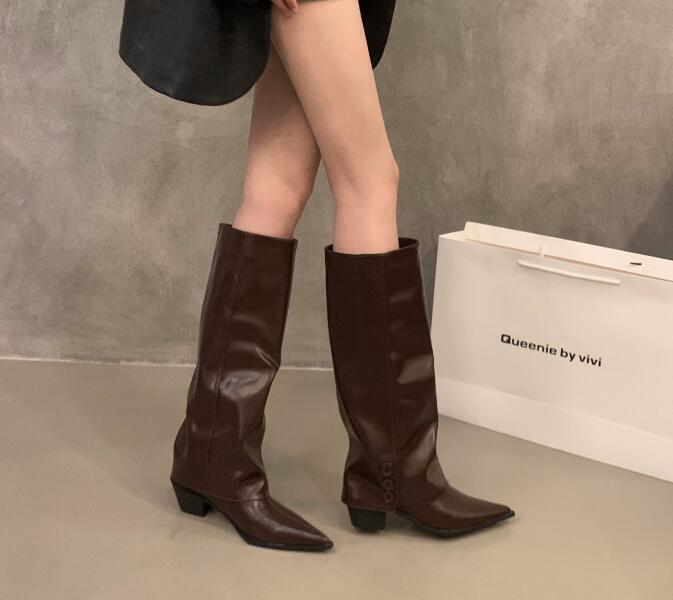 人気推薦上質ワイドシャフトブーツ ポインテッドトゥ ロングブーツ茶色 脚長 24.0cm(38)