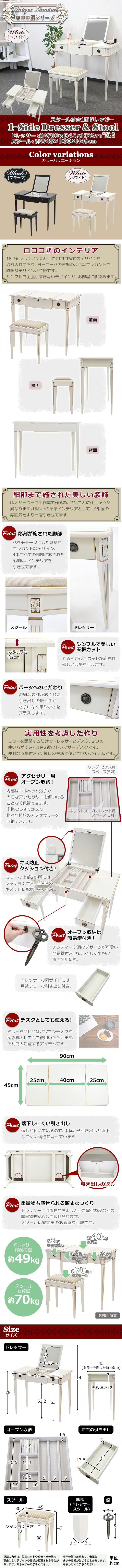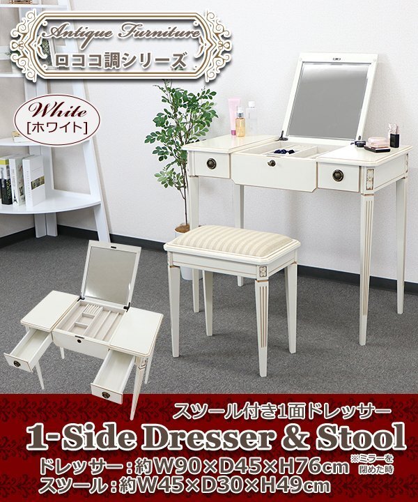 | 商品名 | 送料無料 ロココ調 ドレッサー スツール セット 天板サイズ約W90×約D45cm ホワイト ドレッサーデスク 収納 化粧台 鏡台 メイク台 鏡 ミラー 机 テーブル 木製 椅子 イス チェア 一面 1面 コスメ 小物 アンティーク インテリア 家具 リビング おしゃれ 白 rococof109113wh |