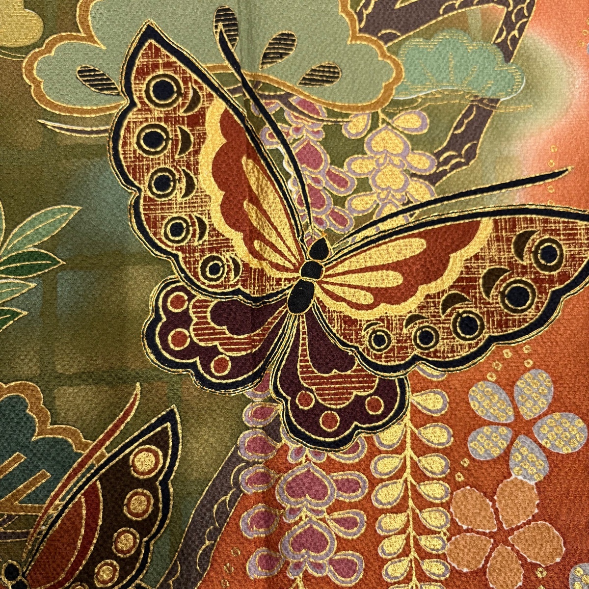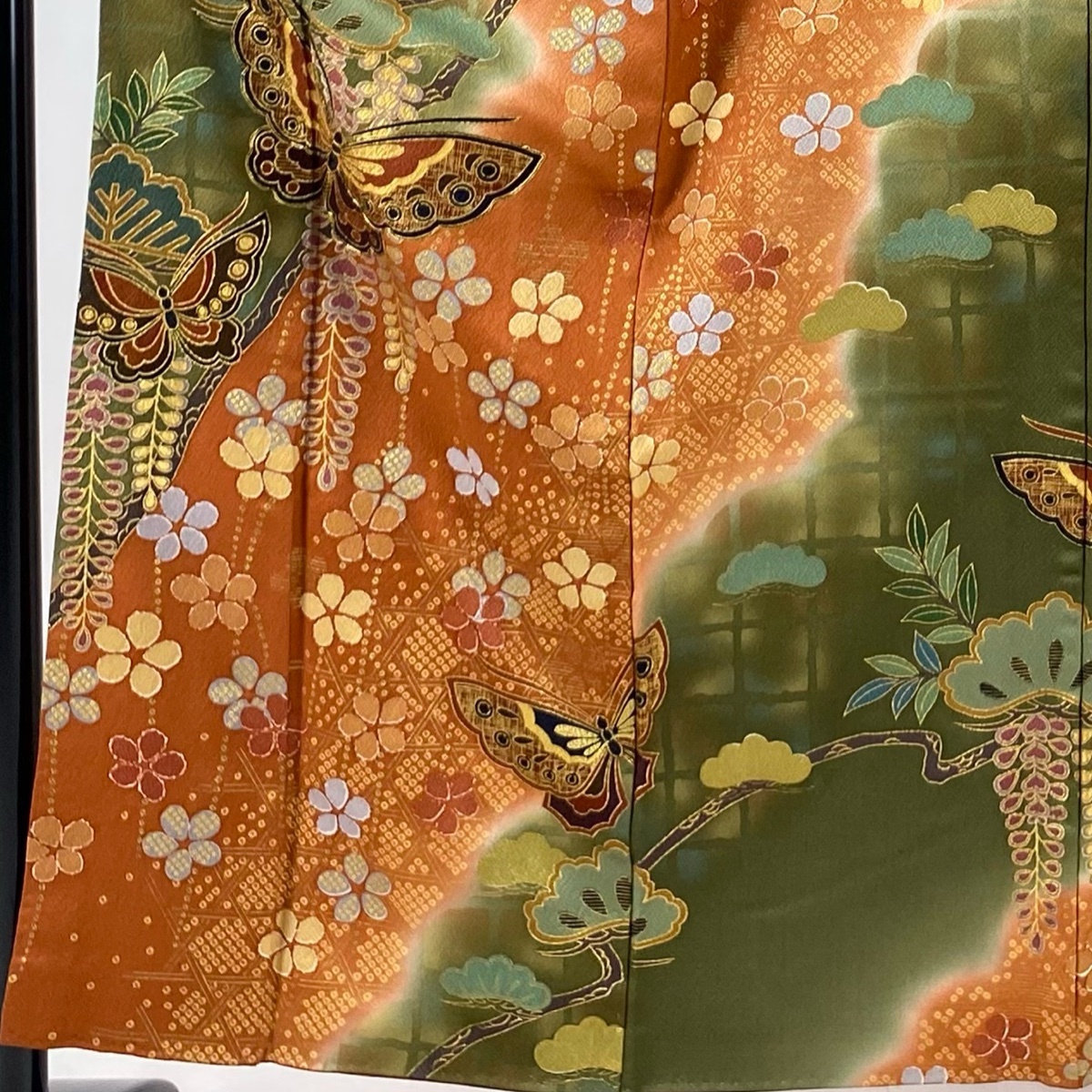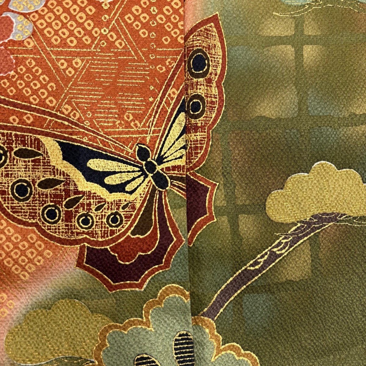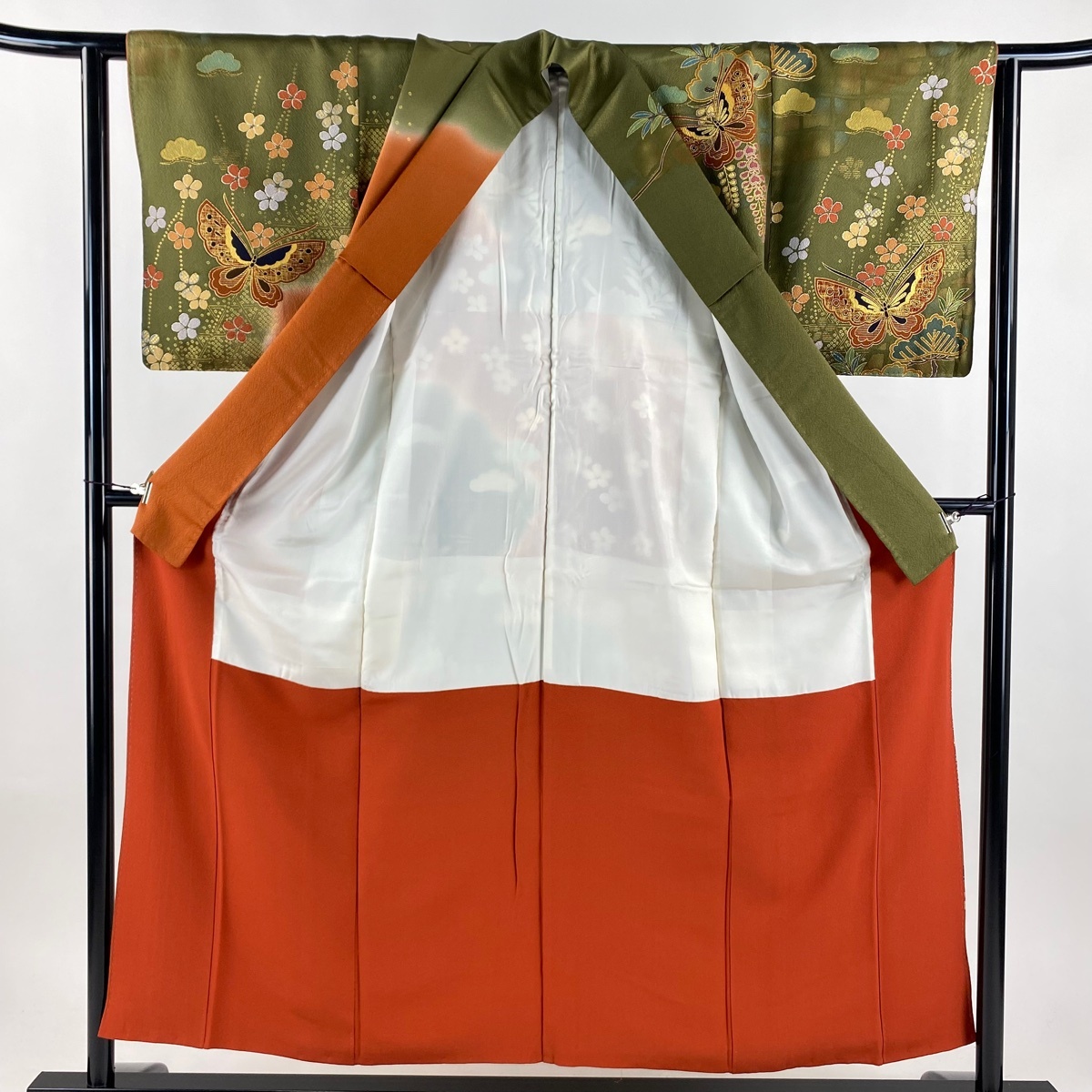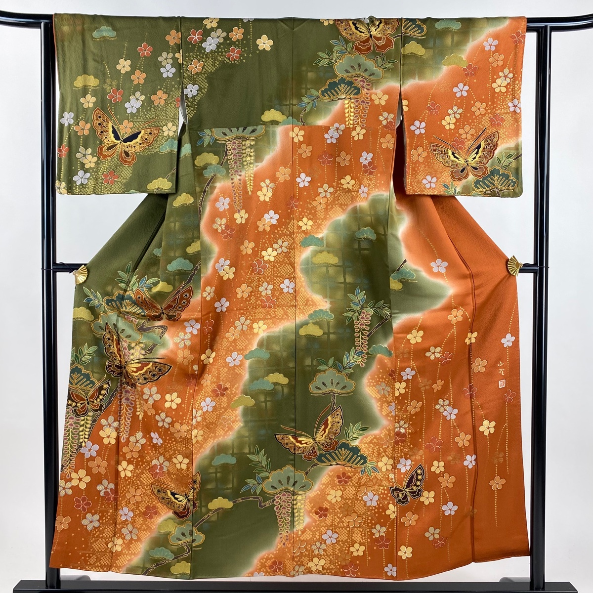 | 訪問着 秀品 落款 蝶 枝垂れ桜 金糸 金彩 茶緑色 袷 身丈153 裄丈61.5 S 正絹 【中古】 |