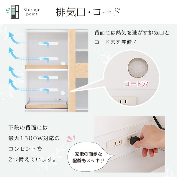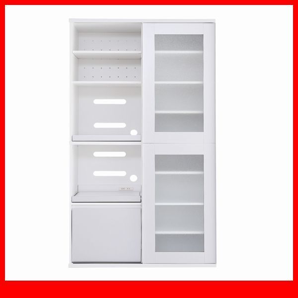 【ポイント】 スライドタイプの新しい食器棚です。 収納スペースを左右に分け、左側に家電収納棚やフルオープンの引出し 右側に計8段の食器収納棚を設け ガラスのスライドドアで楽に開閉・切替が可能です。 |