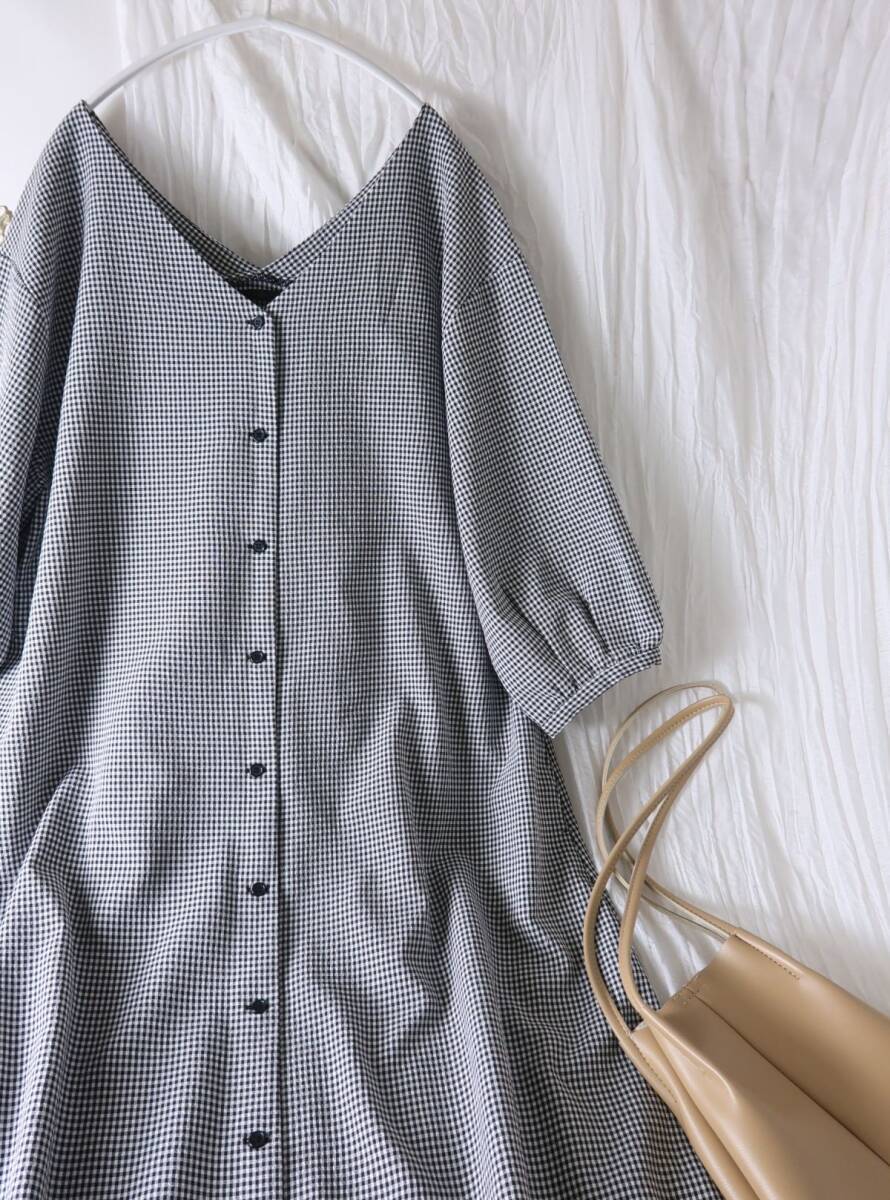 大人の女性にも着て頂きやすい、細やかなギンガムチェック柄が魅力のワンピース。ふんわりとした袖のシルエットや、両Vネック仕様はさりげなく女性らしさを与えてくれる。しっかりと長さがあるから1枚着しやすく、ボタンを開ければ軽い羽織にも早変わり。レイヤードを楽しみたいときはパンツを合わせても◎様々なスタイリングに挑戦しやすいおすすめアイテムです♪