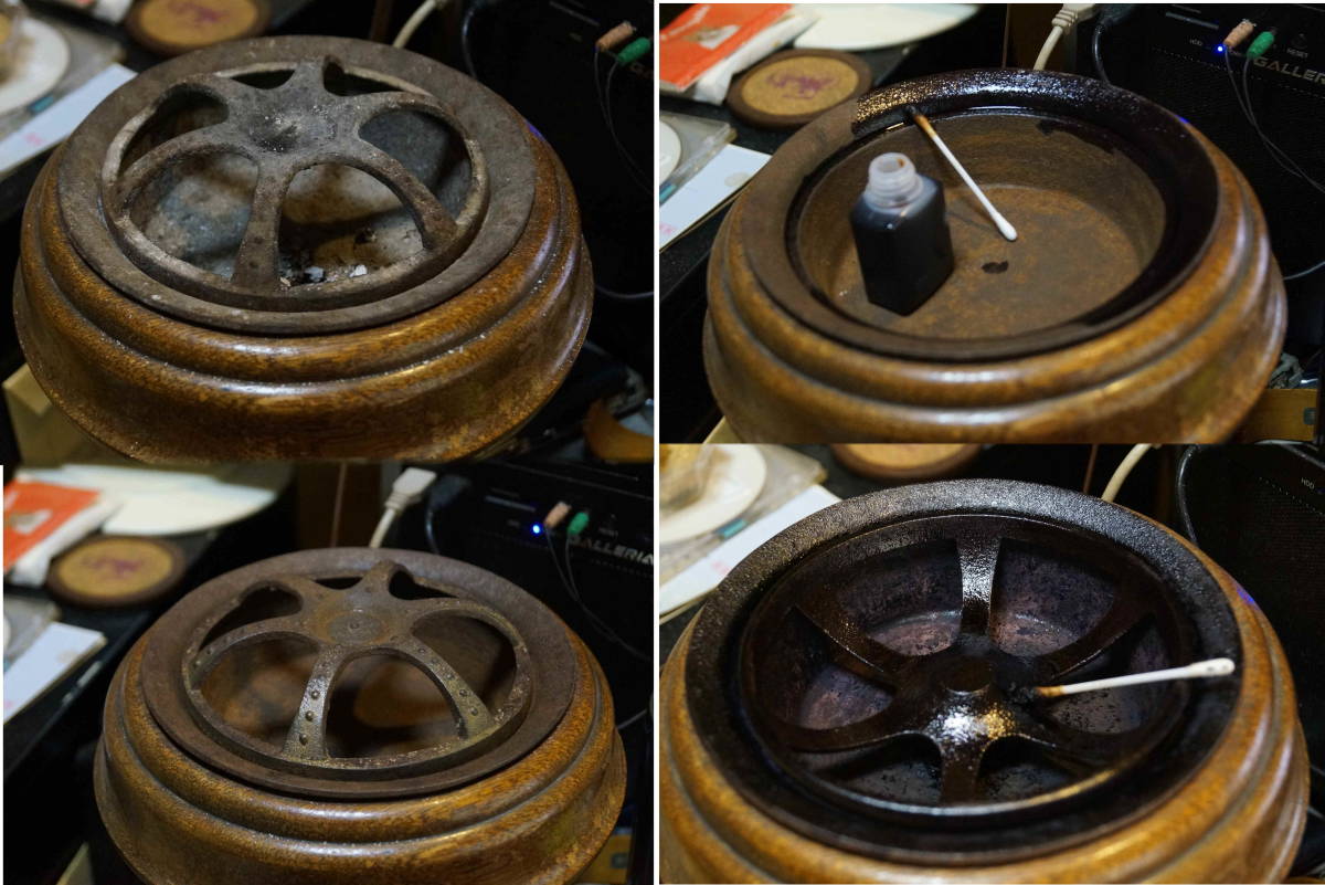 刀剣小道具・鉄瓶・古美術鉄器の赤サビを黒サビに変える防錆・色上げ剤に如何ですか。